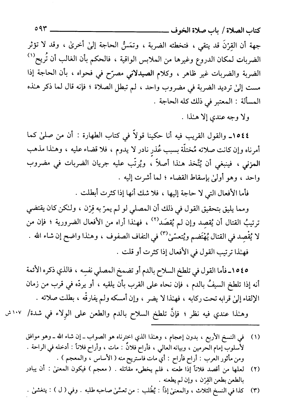 1545 - فأما القول في تلطخ السلاح بالدم أو تضمخ المصلي نفسِه، فالذي ذكره الأئمة أنه إذا تلطخ السيفُ بالدم، فإن نحاه على القرب بأن يلقيه، أو يردّه في قرب من زمان الإلقاء إلى قرابه تحت ركابه، فهذا لا يضر، وإن أمسكه ولم يفارقْه، بطلت صلاته.