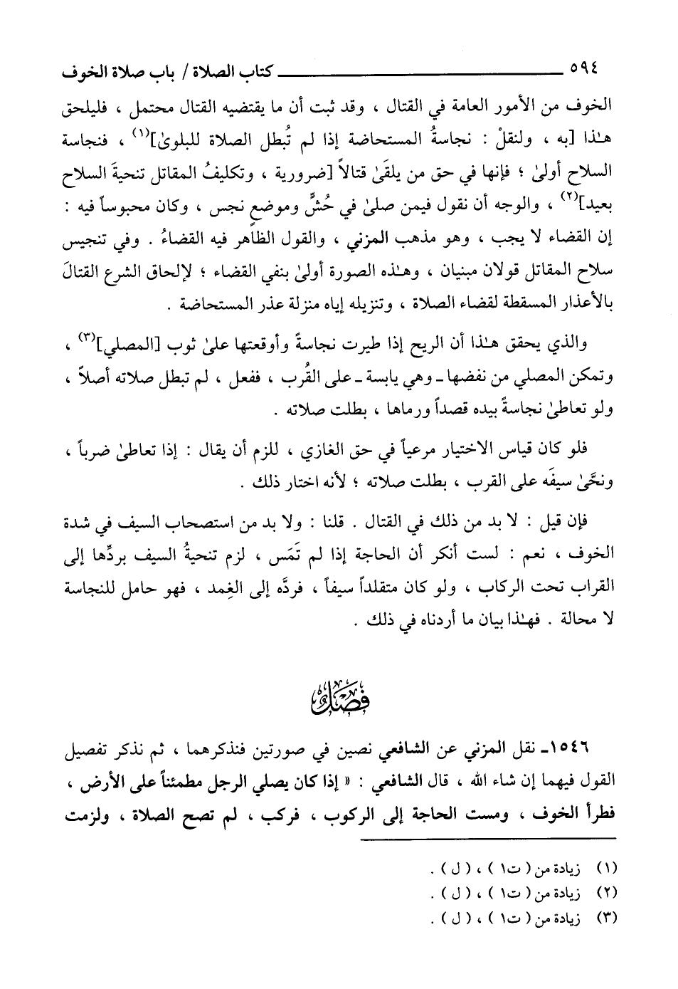 1546 - نقل المزني عن الشافعي نصين في صورتين فنذكرهما، ثم نذكر تفصيل القول فيهما إن شاء الله، قال الشافعي: "إذا كان يصلي الرجل مطمئناً على الأرض، فطرأ الخوف، ومست الحاجة إلى الركوب، فركب، لم تصح الصلاة، ولزمت
