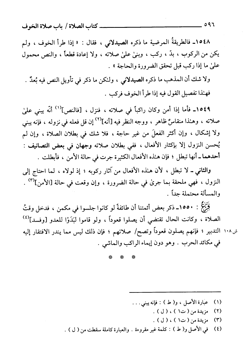 5148 - فالطريقةُ المرضية ما ذكره الصيدلاني، فقال: "إذا طرأ الخوف، ولم يكن من الركوب، بدّ، ركب، وبنى على صلاته، ولا إعادة قطعاً، والنص محمول على ما إذا ركب قبل تحقق الضرورة والحاجة".