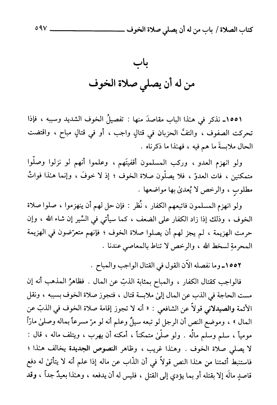 1551 - نذكر في هذا الباب مقاصدَ منها: تفصيلُ الخوف الشديد وسببه، فإذا تحركت الصفوف، والتف الحزبان في قتالٍ واجب، أو في قتالٍ مباح، واقتضت الحال ملابسةَ ما هم فيه، فهذا ما ذكرناه.
