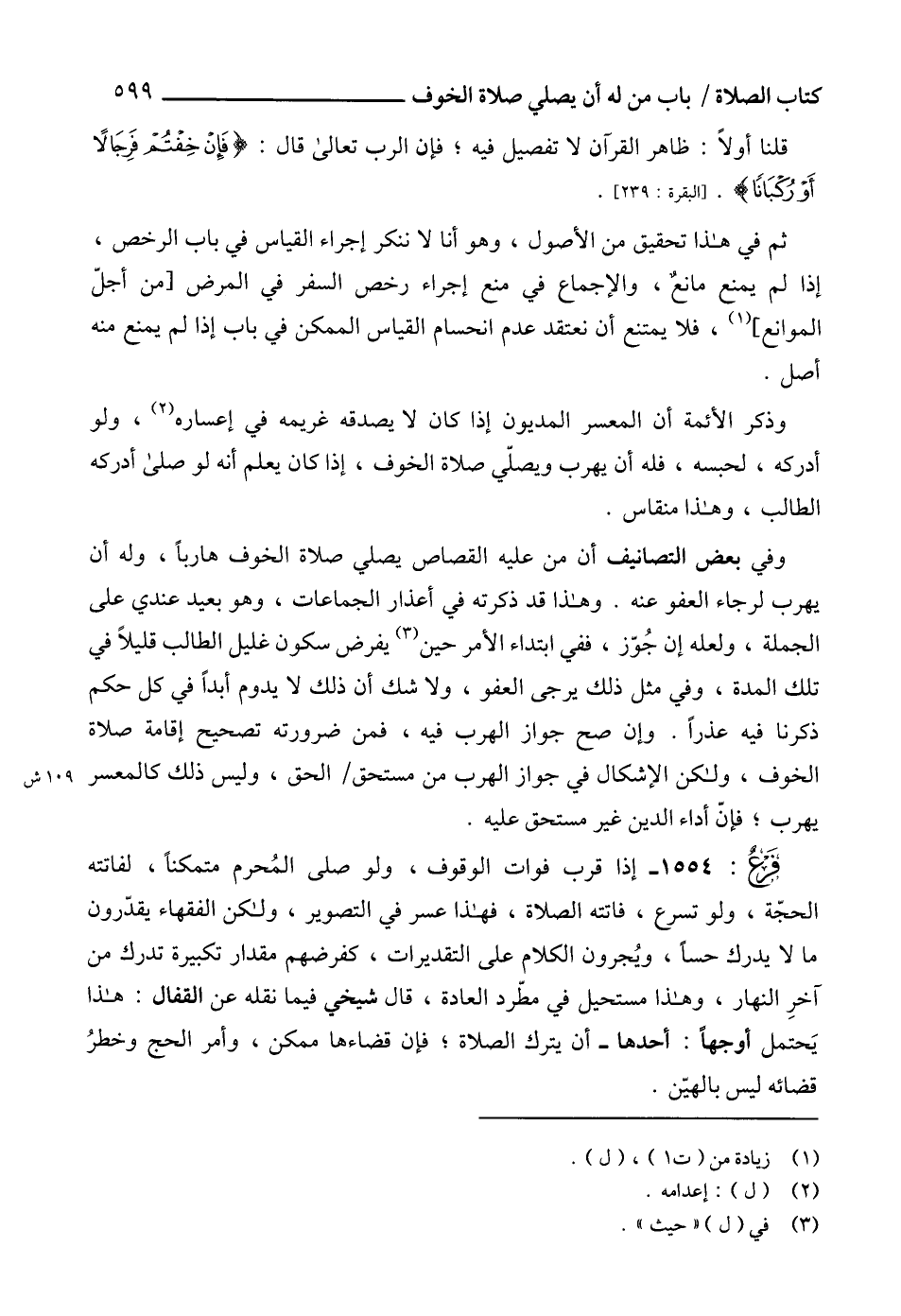 قلنا أولاً: ظاهر القرآن لا تفصيل فيه؛ فإن الرب تعالى قال: {فَإِنْ خِفْتُمْ فَرِجَالًا أَوْ رُكْبَانًا} [البقرة: 239].