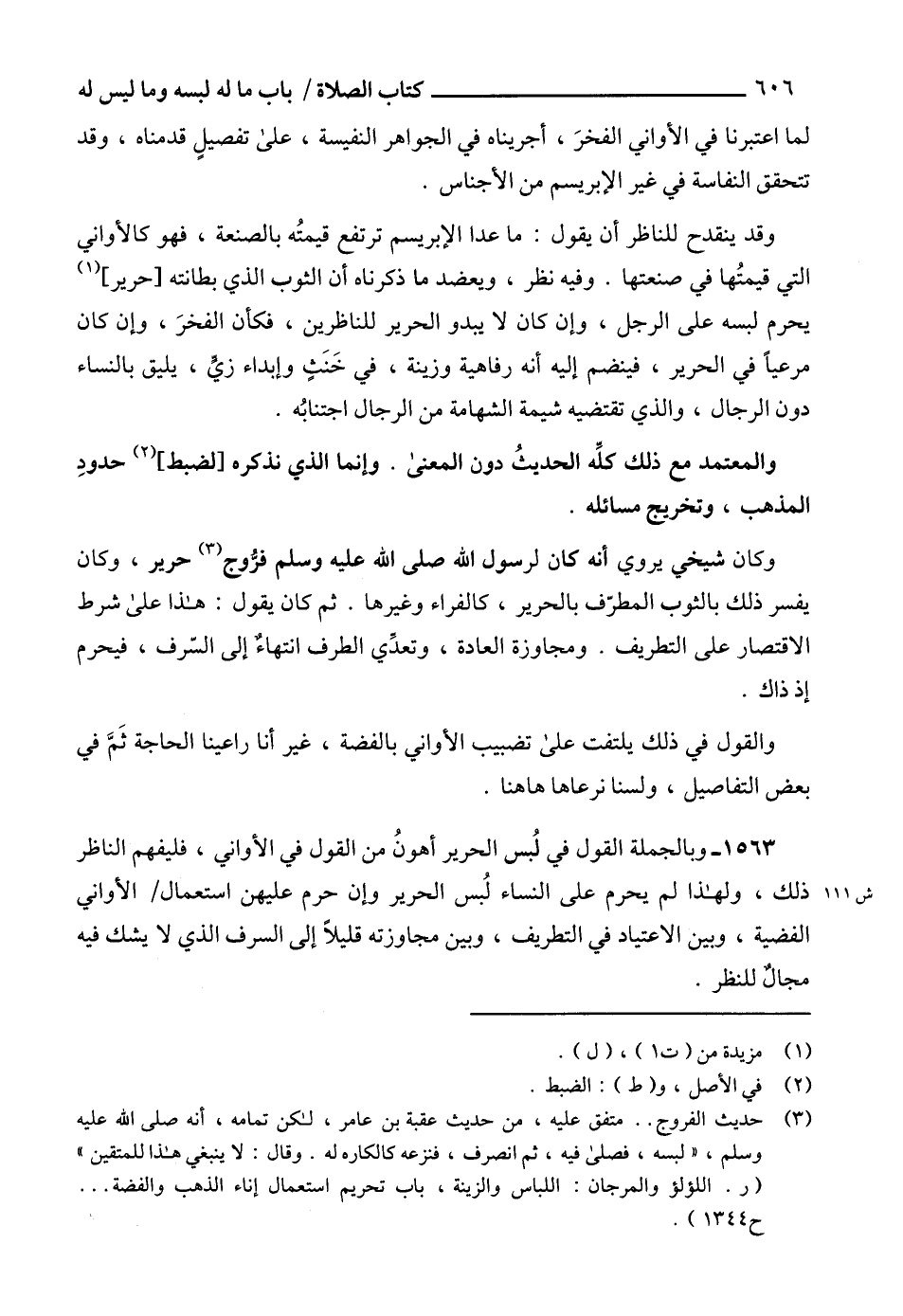 1563 - وبالجملة القول في لُبس الحرير أهونُ من القول في الأواني، فليفهم الناظر ذلك، ولهذا لم يحرم على النساء لُبس الحرير وإن حرم عليهن استعمال الأواني الفضية، وبين الاعتياد في التطريف، وبين مجاوزته قليلاً إلى السرف الذي لا يشك فيه مجالٌ للنظر.