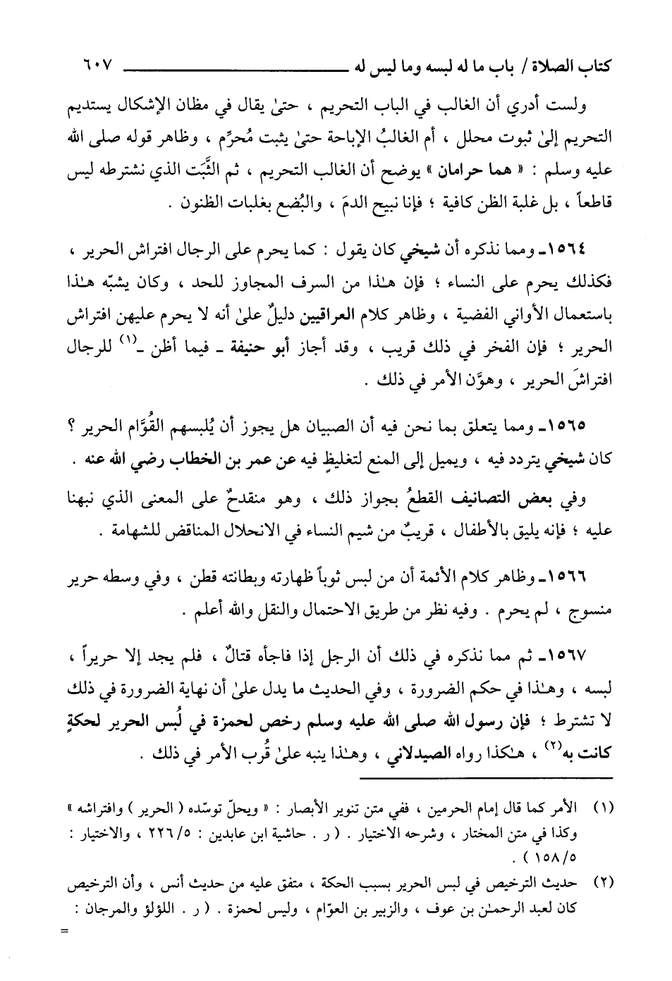 (1) الأمر كما قال إمام الحرمين، ففي متن تنوير الأبصار: "ويحلّ توسّده (الحرير) وافتراشه" وكذا في متن المختار، وشرحه الاختيار. (ر. حاشية ابن عابدين: 5/ 226، والاختيار: 5/ 158).