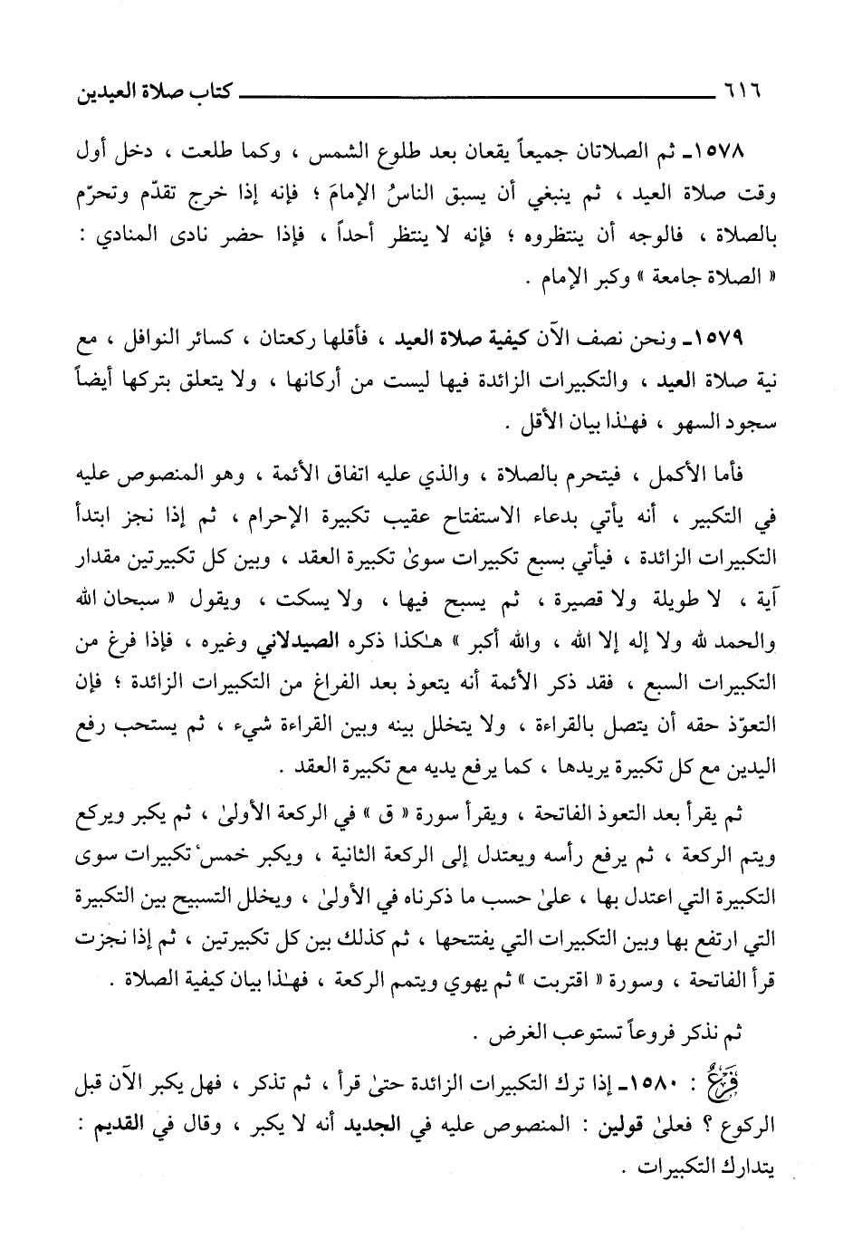 1579 - ونحن نصف الآن كيفية صلاة العيد، فأقلها ركعتان، كسائر النوافل، مع نية صلاة العيد، والتكبيرات الزائدة فيها ليست من أركانها، ولا يتعلق بتركها أيضاً سجود السهو، فهذا بيان الأقل.