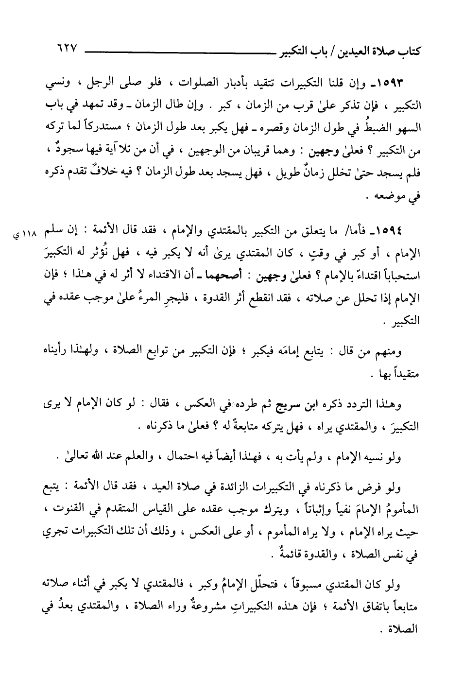 1593 - وإن قلنا التكبيرات تتقيد بأدبار الصلوات، فلو صلى الرجل، ونسي التكبير، فإن تذكر على قرب من الزمان، كبر. وإن طال الزمان -وقد تمهد في باب السهو الضبطُ في طول الزمان وقصره- فهل يكبر بعد طول الزمان؛ مستدركاً لما تركه من التكبير؟ فعلى وجهين: وهما قريبان من الوجهين، في أن من تلا آية فيها سجود، فلم يسجد حتى تخلل زمانٌ طويل، فهل يسجد بعد طول الزمان؟ فيه خلاف تقدم ذكره في موضعه.