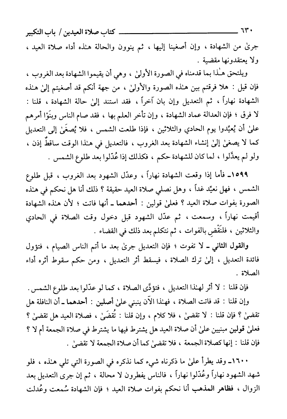 1600 - وقد يطرأ على ما ذكرناه شيء كما نذكره في الصورة التي تلي هذه، فلو شهد الشهود نهاراً وعُدّلوا نهاراً، فالناس يفطرون لا محالة، ثم إن جرى التعديل بعد الزوال، فظاهر المذهب أنا نحكم بفوات صلاة العيد؛ فإن الشهادة سُمعت وعُدلت