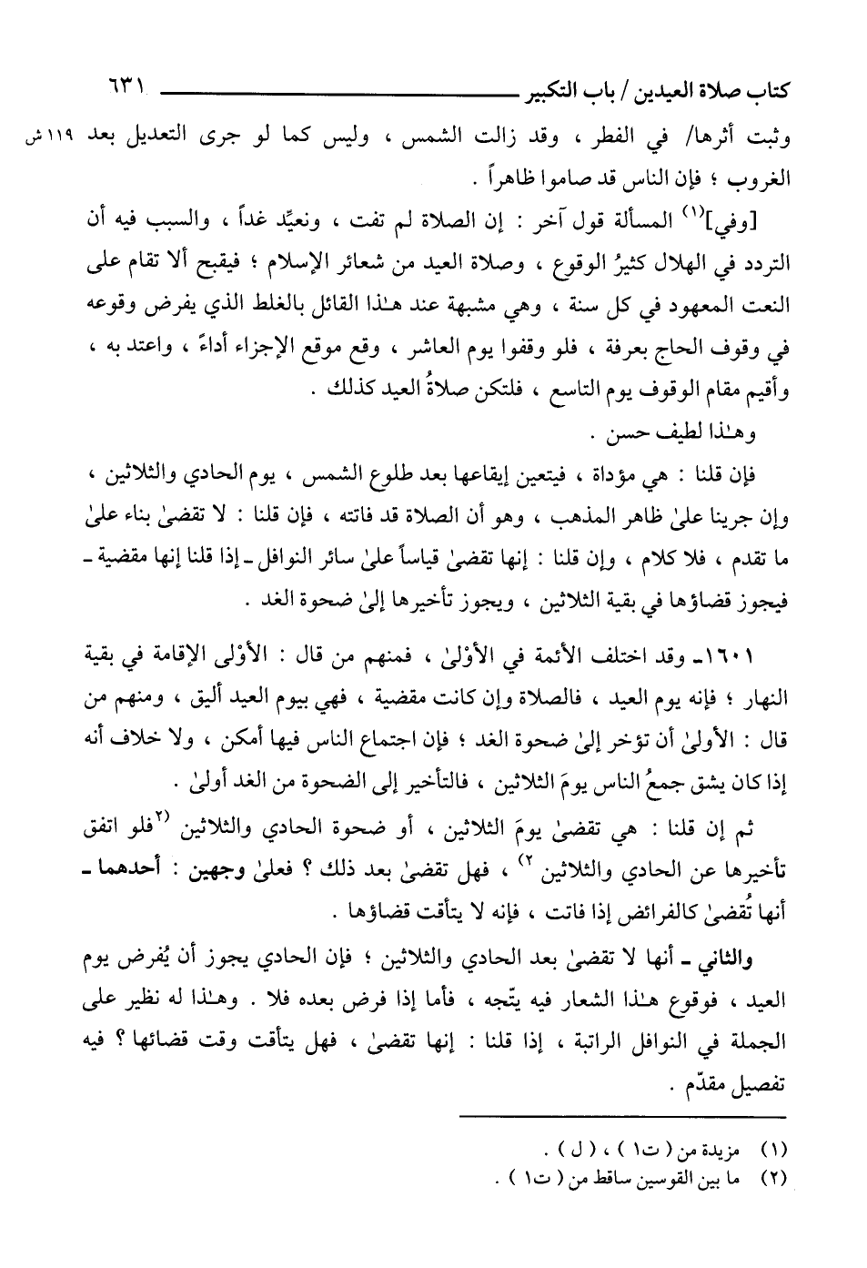 1601 - وقد اختلف الأئمة في الأوْلى، فمنهم من قال: الأوْلى الإقامة في بقية النهار؛ فإنه يوم العيد، فالصلاة وإن كانت مقضية، فهي بيوم العيد أليق، ومنهم من قال: الأولى أن تؤخر إلى ضحوة الغد؛ فإن اجتماع الناس فيها أمكن، ولا خلاف أنه إذا كان يشق جمعُ الناس يومَ الثلاثين، فالتأخير إلى الضحوة من الغد أولى.