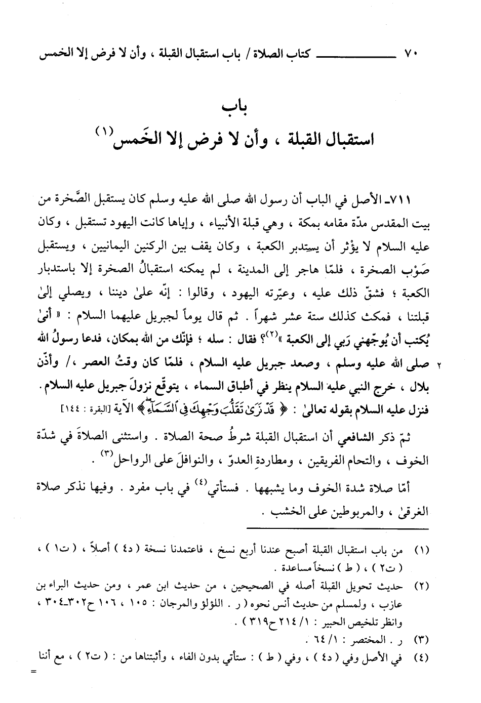 (¬1) من باب استقبال القبلة أصبح عندنا أربع نسخ، فاعتمدنا نسخة (د 4) أصلاً، (ت 1)، (ت 2)، (ط) نسخاً مساعدة.