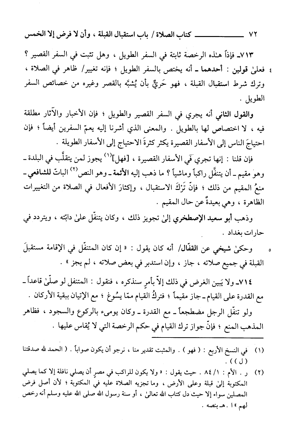 (¬2) ر. الأم: 1/ 84. حيث يقول: "ولا يكون للراكب في مصير أن يصلي نافلة إلا كما يصلي المكتوبة إلى قبلة وعلى الأرض، وما تجزيه الصلاة عليه في المكتوبة؛ لأن أصل فرض المصلين سواء إلا حيث دل كتاب الله تعالى، أو سنة رسول الله صلى الله عليه وسلم أنه رخص لهم" ا. هـ بنصه.