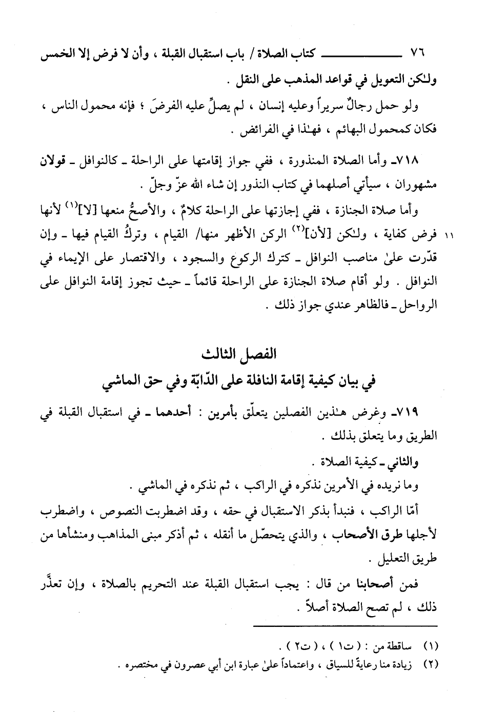 719 - وغرض هذين الفصلين يتعلّق بأمرين: أحدهما - في استقبال القبلة في الطريق وما يتعلق بذلك.