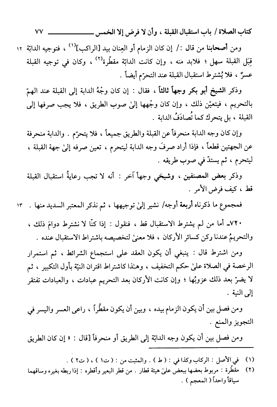 ومن أصحابنا من قال: إن كان الزمام أو العِنان بيد [الراكب] (¬1)، فتوجيه الدابّة قِبَل القبلة سهل؛ فلا بد منه، وإن كانت الدابّة مقطّرة (¬2)، وكان في توجيه القبلة عسر، فلا يُشترط استقبال القبلة عند التحرّم أيضاً.