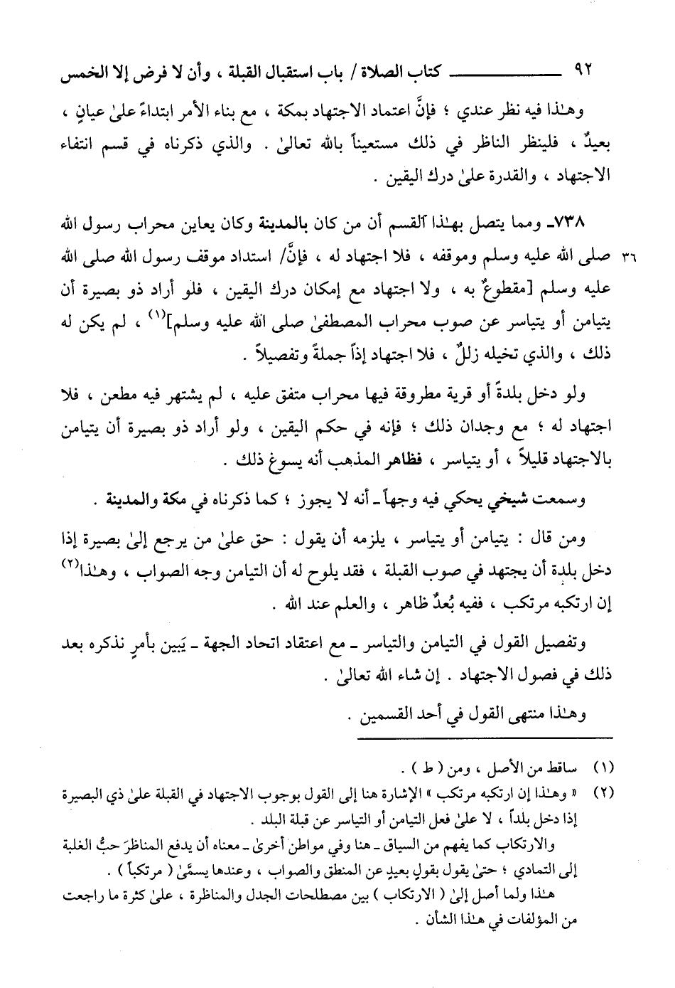 وتفصيل القول في التيامن والتياسر -مع اعتقاد اتحاد الجهة- يَبين بأمرٍ نذكره بعد ذلك في فصول الاجتهاد. إن شاء الله تعالى.