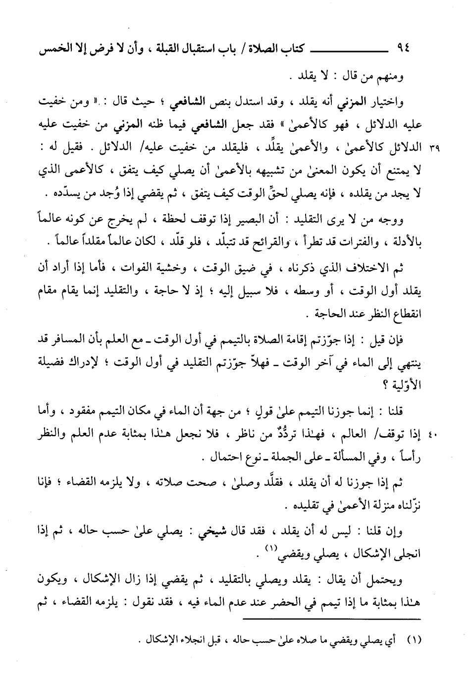 واختيار المزني أنه يقلد، وقد استدل بنص الشافعي؛ حيث قال: "ومن خفيت عليه الدلائل، فهو كالأعمى" فقد جعل الشافعي فيما ظنه المزني من خفيت عليه الدلائل كالأعمى، والأعمى يقلد، فليقلد من خفيت عليه الدلائل. فقيل له: لا يمتنع أن يكون المعنى من تشبيهه بالأعمى أن يصلي كيف يتفق، كالأعمى الذي لا يجد من يقلده، فإنه يصلي لحقِّ الوقت كيف يتفق، ثم يقضي إذا وُجد من يسدّده.