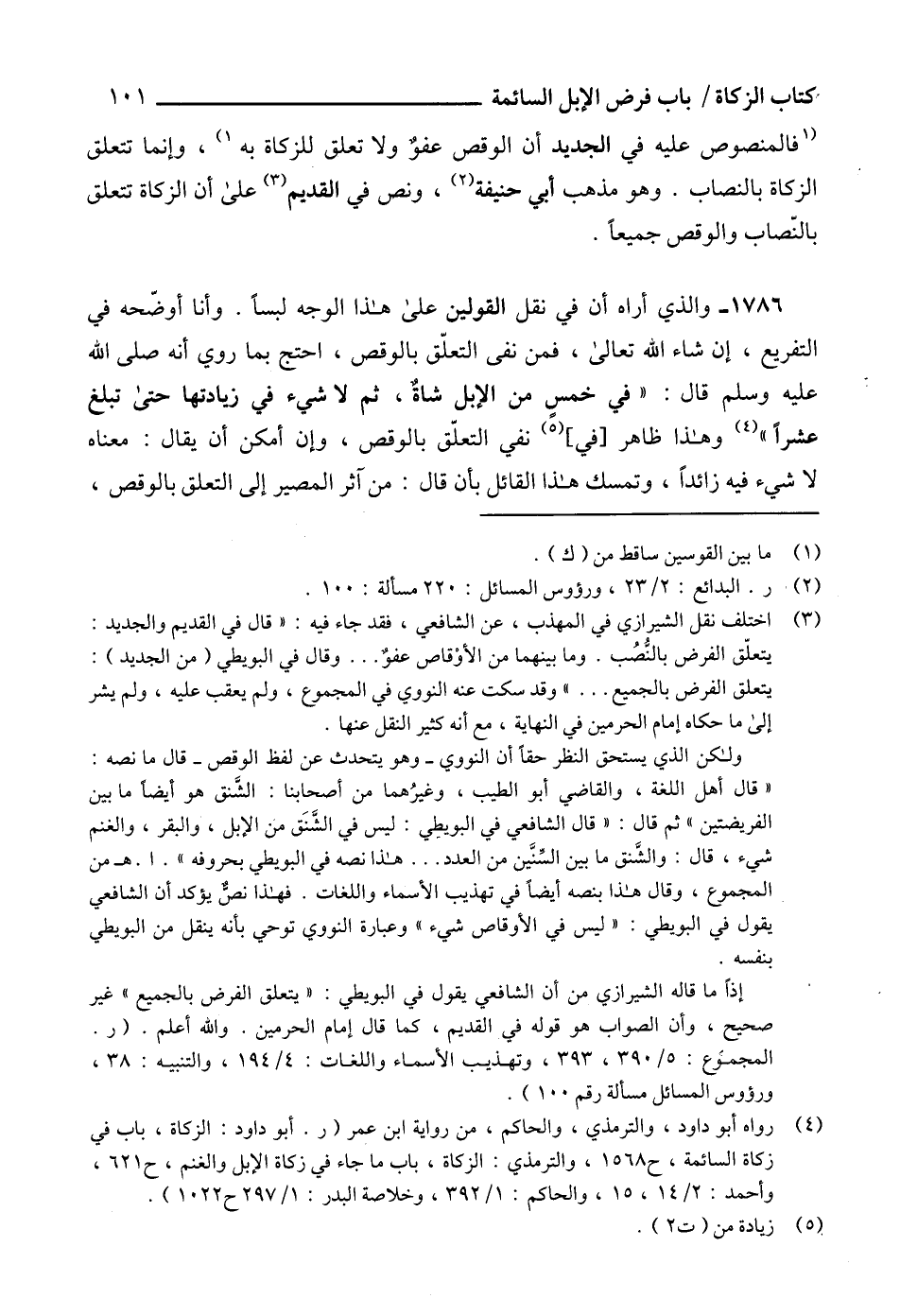(3) اختلف نقل الشيرازي في المهذب، عن الشافعي، فقد جاء فيه: "قال في القديم والجديد: يتعلّق الفرض بالنُّصُب. وما بينهما من الأوْقاص عفوٌ ... وقال في البويطي (من الجديد): يتعلق الفرض بالجميع ... " وقد سكت عنه النووي في المجموع، ولم يعقب عليه، ولم يشر إلى ما حكاه إمام الحرمين في النهاية، مع أنه كثير النقل عنها.