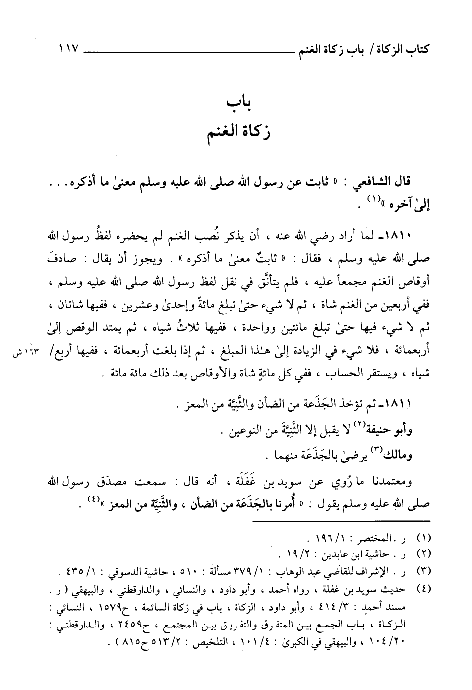 (4) حديث سويد بن غفلة، رواه أحمد، وأبو داود، والنسائي، والدارقطني، والبيهقي (ر. مسند أحمد: 3/ 414، وأبو داود، الزكاة، باب في زكاة السائمة، ح 1579، النسائي: الزكاة، باب الجمع بين المتفرق والتفريق بين المجتمع، ح 2459، والدارقطني: 20/ 104، والبيهقي في الكبرى: 4/ 101، التلخيص: 2/ 513 ح 815).