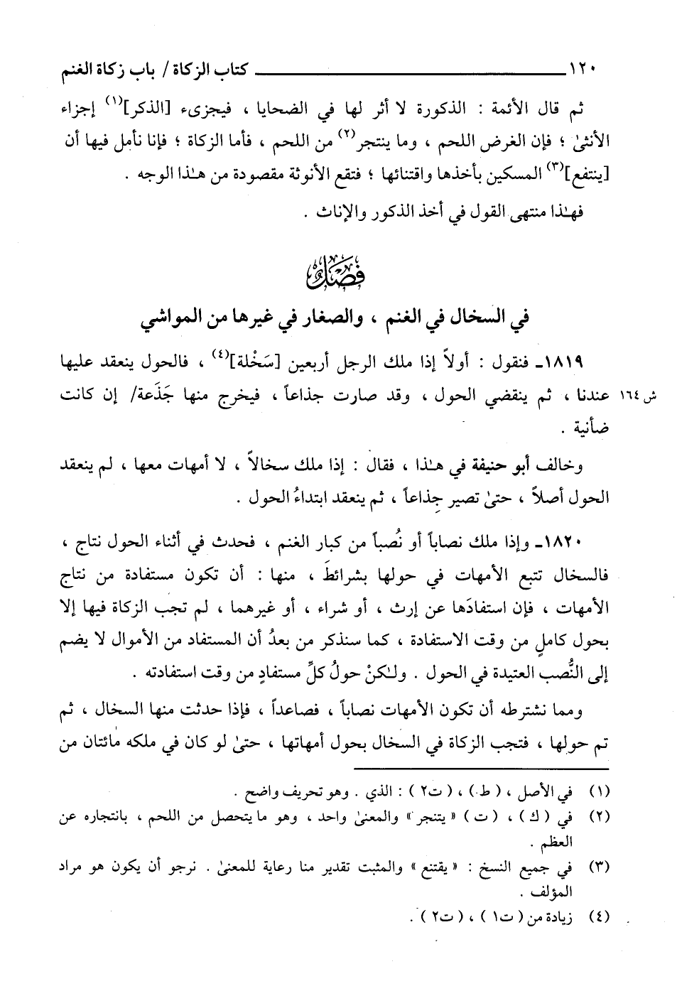 1820 - وإذا ملك نصاب أو نُصباً من كبار الغنم، فحدث في أثناء الحول نتاج، فالسخال تتبع الأمهات في حولها بشرائطَ، منها: أن تكون مستفادة من نتاج الأمهات، فإن استفادَها عن إرث، أو شراء، أو غيرهما، لم تجب الزكاة فيها إلا بحول كاملٍ من وقت الاستفادة، كما سنذكر من بعدُ أن المستفاد من الأموال لا يضم إلى النصب العتيدة في الحول. ولكنْ حولُ كلِّ مستفاد من وقت استفادته.