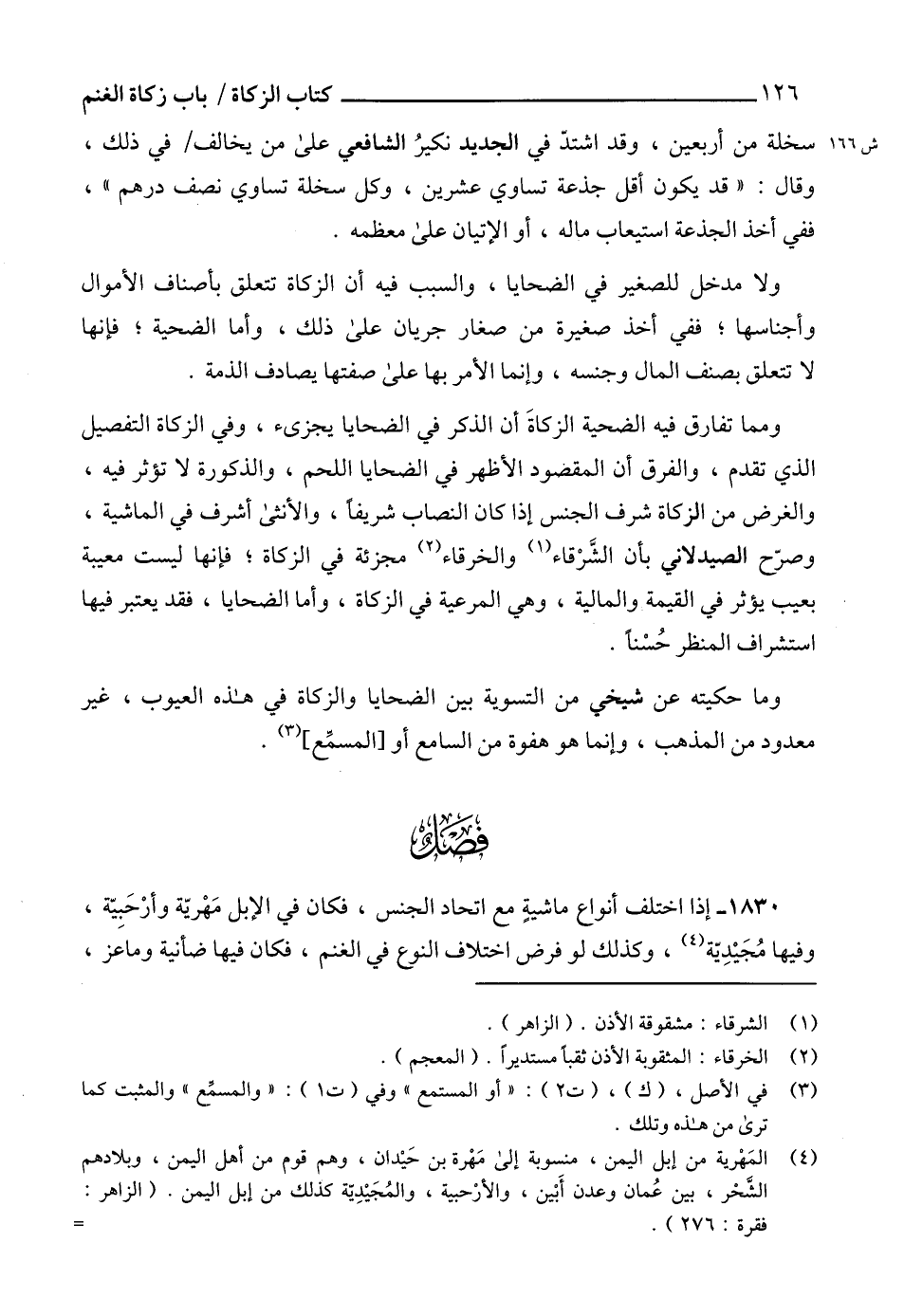 1830 - إذا اختلف أنواع ماشيةٍ مع اتحاد الجنس، فكان في الإبل مَهْريّة وأرْحَبِيّة، وفيها مُجَيْدِيّة (4)، وكذلك لو فرض اختلاف النوع في الغنم، فكان فيها ضأنية وماعز،