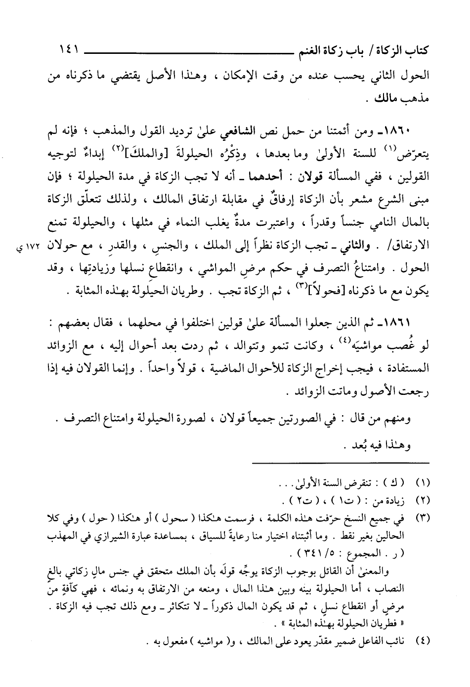 1861 - ثم الذين جعلوا المسألة على قولين اختلفوا في محلهما، فقال بعضهم: لو غُصب مواشيَه (4)، وكانت تنمو وتتوالد، ثم ردت بعد أحوال إليه، مع الزوائد المستفادة، فيجب إخراج الزكاة للأحوال الماضية، قولاً واحداً. وإنما القولان فيه إذا رجعت الأصول وماتت الزوائد.