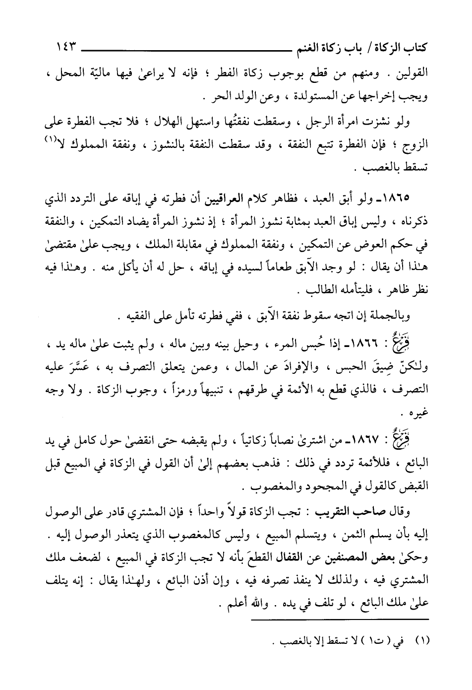 1867 - من اشترى نصاباً زكاتياً، ولم يقبضه حتى انقضى حول كامل في يد البائع، فللأئمة تردد في ذلك: فذهب بعضهم إلى أن القول في الزكاة في المبيع قبل القبض كالقول في المجحود والمغصوب.