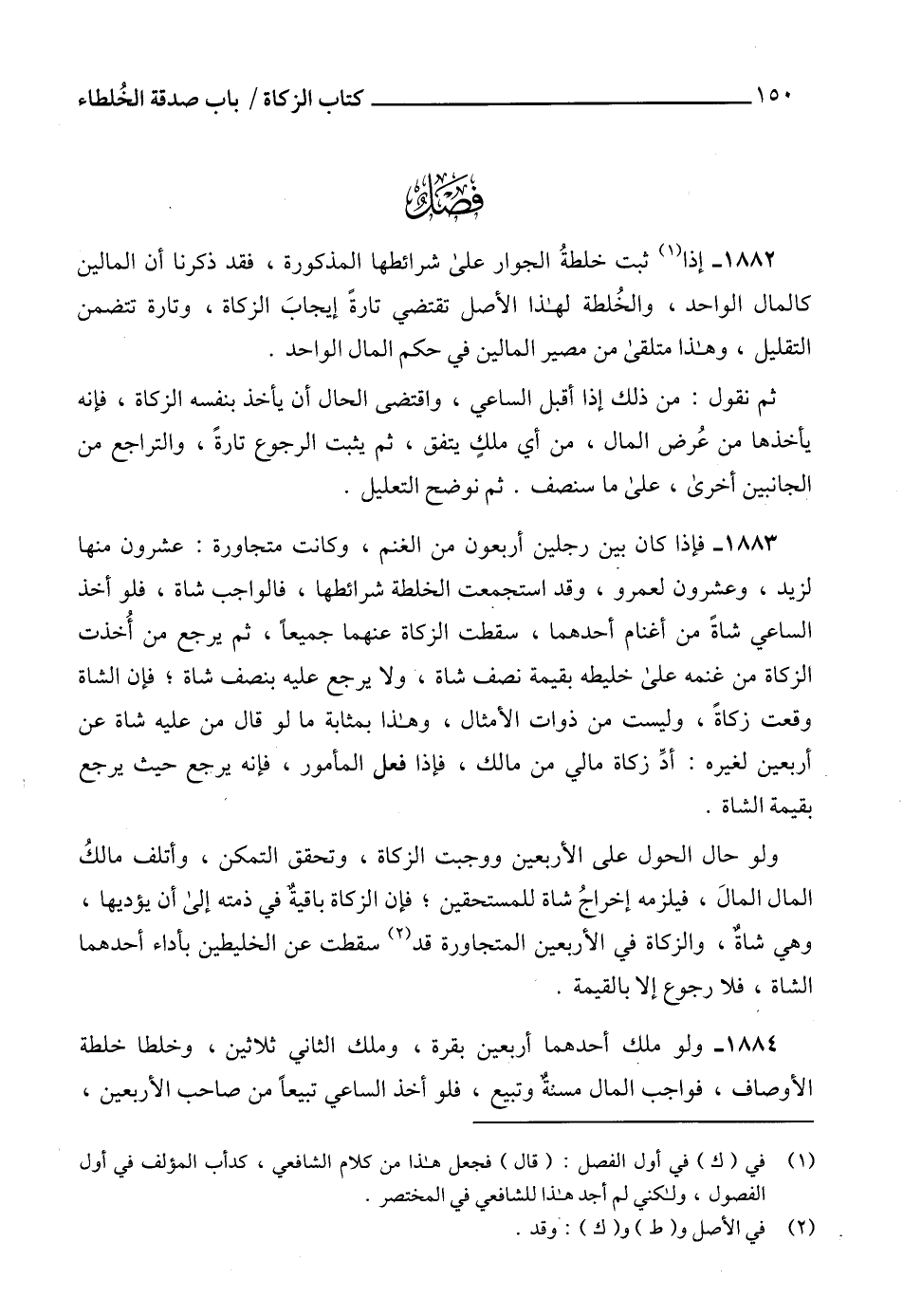 1882 - إذا (1) ثبت خلطةُ الجوار على شرائطها المذكورة، فقد ذكرنا أن المالين كالمال الواحد، والخُلطة لهذا الأصل تقتضي تارةً إيجابَ الزكاة، وتارة تتضمن التقليل، وهذا متلقى من مصير المالين في حكم المال الواحد.