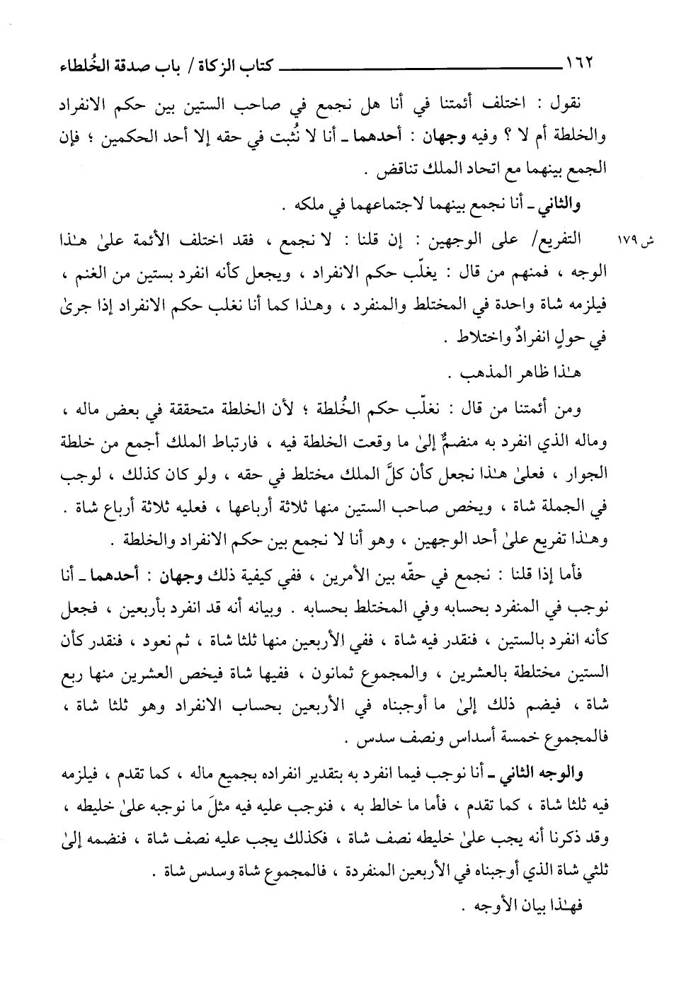 ومن أئمتنا من قال: نغلّب حكم الخُلطة؛ لأن الخلطة متحققة في بعض ماله، وماله الذي انفرد به منضمٌّ إلى ما وقعت الخلطة فيه، فارتباط الملك أجمع من خلطة الجوار، فعلى هذا نجعل كأن كلَّ الملك مختلط في حقه، ولو كان كذلك، لوجب في الجملة شاة، ويخص صاحب الستين منها ثلاثة أرباعها، فعليه ثلاثة أرباع شاة.