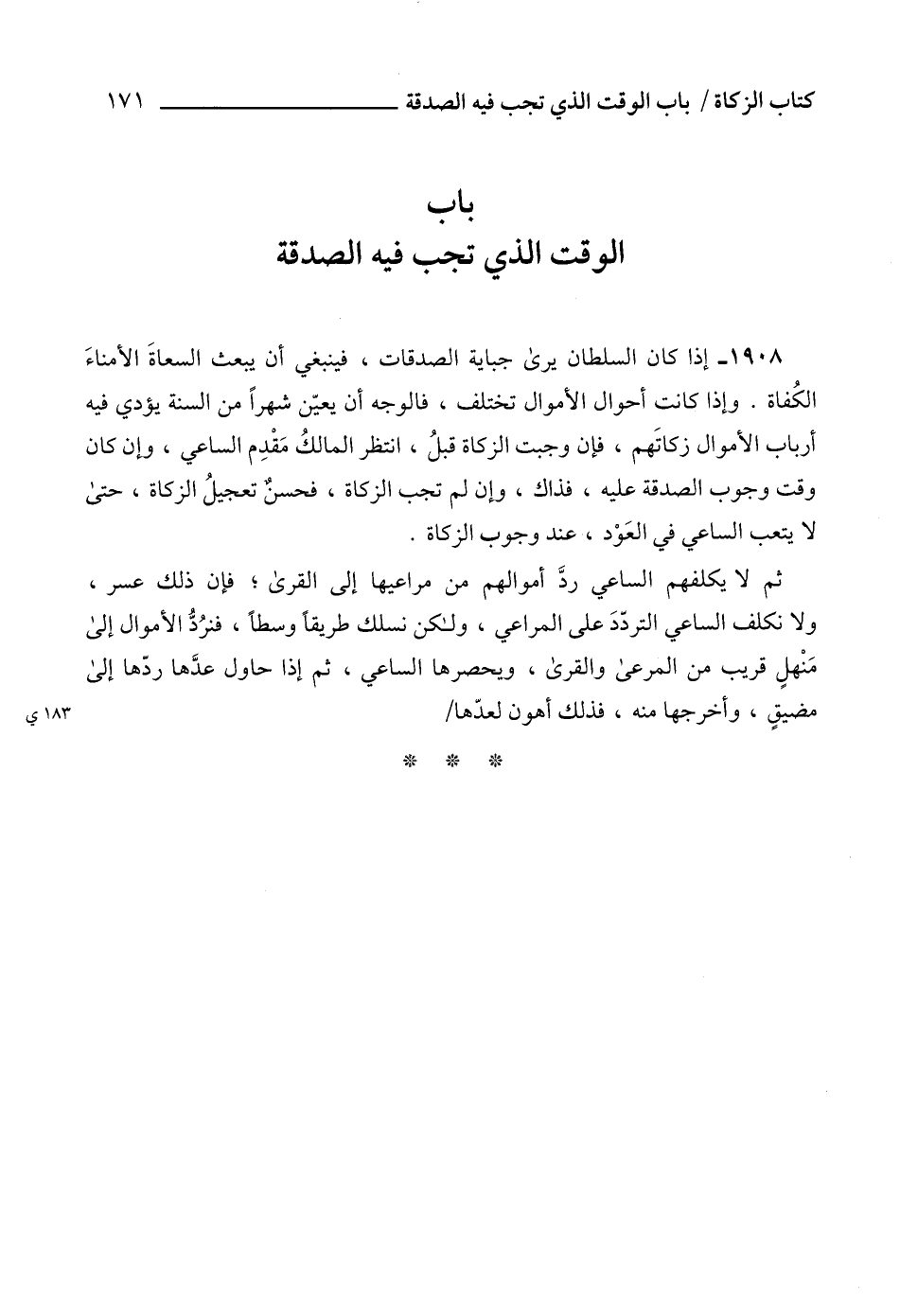 1908 - إذا كان السلطان يرى جباية الصدقات، فينبغي أن يبعث السعاةَ الأمناءَ الكُفاة. وإذا كانت أحوال الأموال تختلف، فالوجه أن يعيّن شهراً من السنة يؤدي فيه أرباب الأموال زكاتَهم، فإن وجبت الزكاة قبلُ، انتظر المالكُ مَقْدِم الساعي، وإن كان وقت وجوب الصدقة عليه، فذاك، وإن لم تجب الزكاة، فحسنٌ تعجيلُ الزكاة، حتى لا يتعب الساعي في العَوْد، عند وجوب الزكاة.