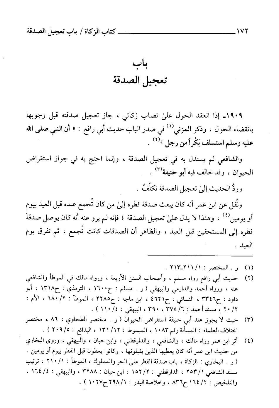1909 - إذا انعقد الحول على نصاب زكاتي، جاز تعجيل صدقته قبل وجوبها بانقضاء الحول، وذكر المزني (1) في صدر الباب حديث أبي رافع: "أن النبي صلى الله عليه وسلم استسلف بكْراً من رجل" (2).