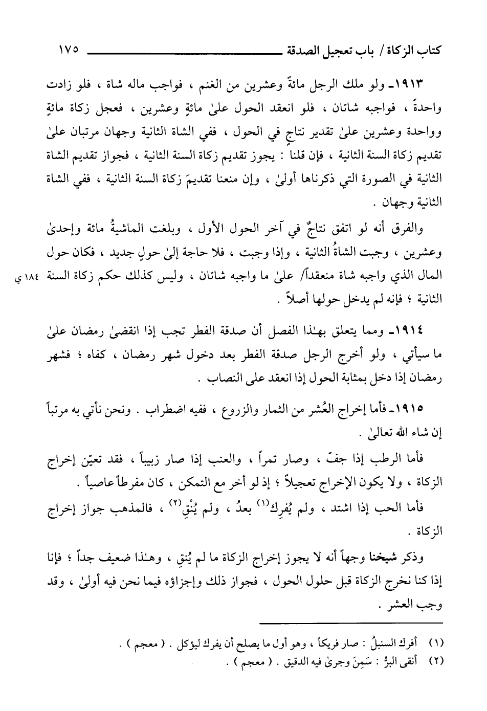 1913 - ولو ملك الرجل مائة وعشرين من الغنم، فواجب ماله شاة، فلو زادت واحدةً، فواجبه شاتان، فلو انعقد الحول على مائة وعشرين، فعجل زكاة مائةٍ وواحدة وعشرين على تقدير نتاجٍ في الحول، ففي الشاة الثانية وجهان مرتبان على تقديم زكاة السنة الثانية، فإن قلنا: يجوز تقديم زكاة السنة الثانية، فجواز تقديم الشاة الثانية في الصورة التي ذكرناها أولى، وإن منعنا تقديمَ زكاة السنة الثانية، ففي الشاة الثانية وجهان.