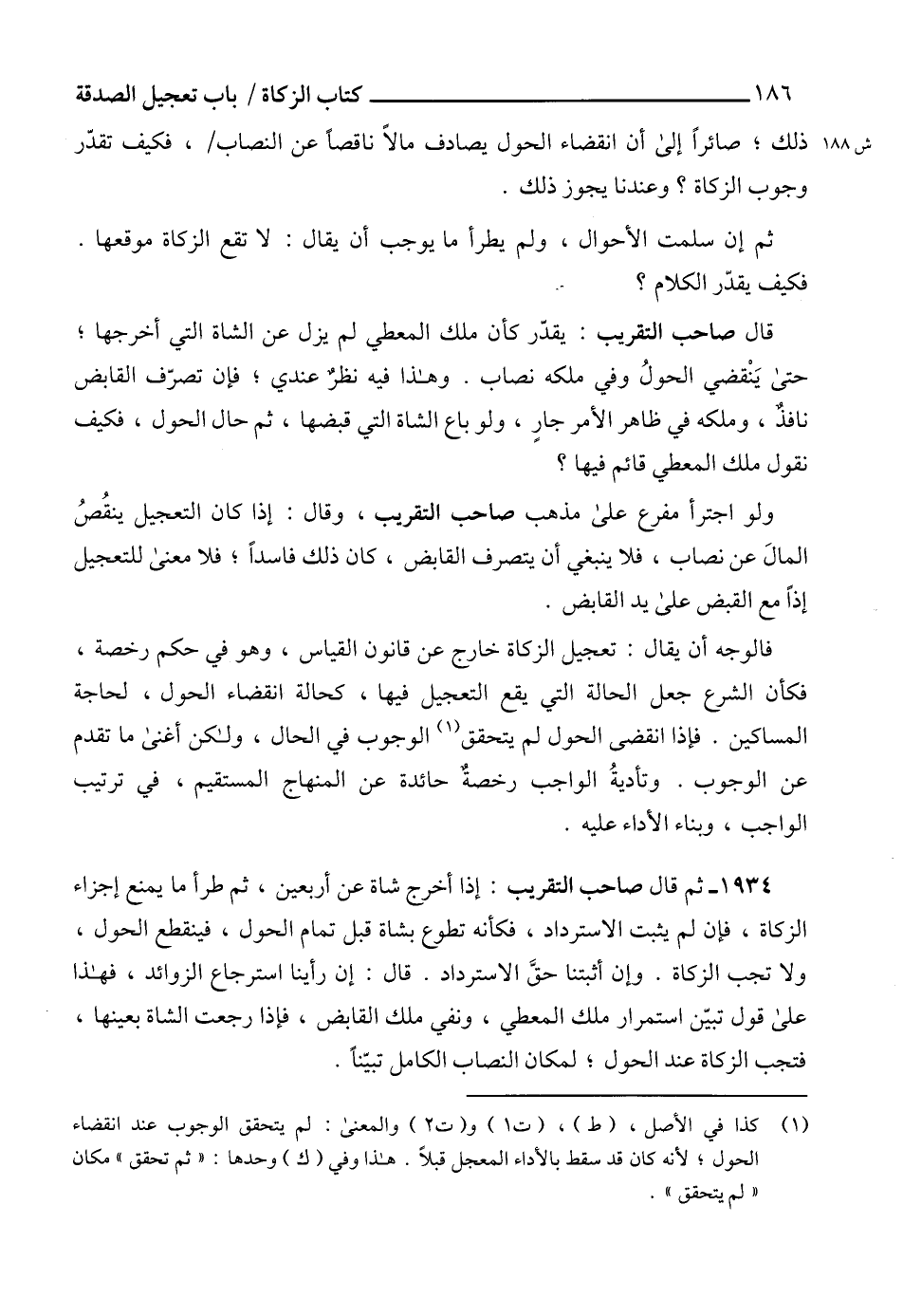(1) كذا في الأصل، (ط)، (ت 1) و (ت 2) والمعنى: لم يتحقق الوجوب عند انقضاء الحول؛ لأنه كان قد سقط بالأداء المعجل قبلاً. هذا وفي (ك) وحدها: "ثم تحقق" مكان "لم يتحقق".