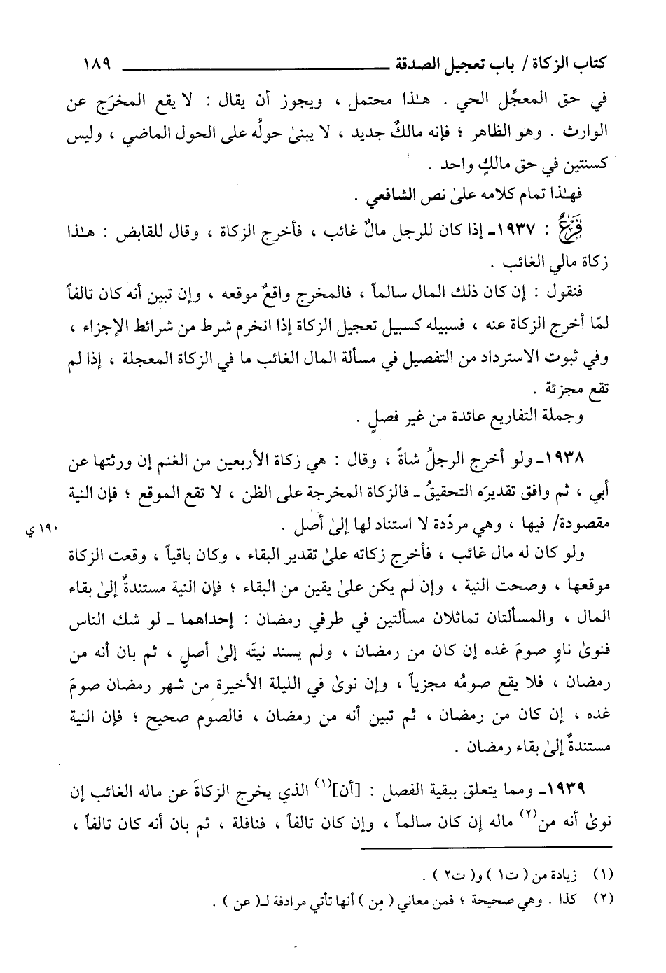 1939 - ومما يتعلق ببقية الفصل: [أن] (1) الذي يخرج الزكاةَ عن ماله الغائب إن نوى أنه من (2) ماله إن كان سالماً، وإن كان تالفاً، فنافلة، ثم بان أنه كان تالفاً،