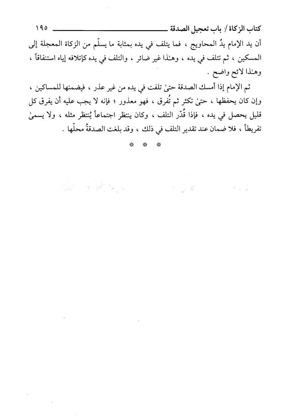 أن يد الإمام يدُ المحاويج، فما يتلف في يده بمثابة ما يسلّم من الزكاة المعجلة إلى المسكين، ثم تتلف في يده، وهذا غير ضائر، والتلف في يده كإتلافه إياه استنفاقاً، وهذا لائح واضح.