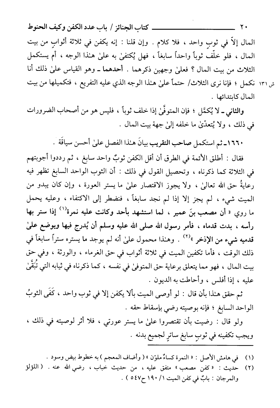 (2) حديث: "كفن مصعب" متفق عليه، من حديث خباب، رضي الله عنه. (اللؤلؤ والمرجان: بابٌ في كفن الميت 1/ 190 ح 547).