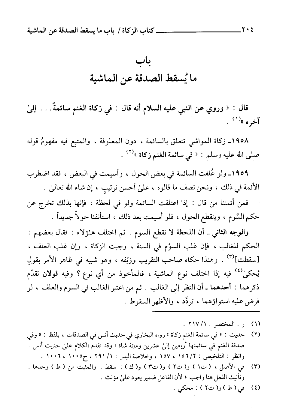 1958 - زكاة المواشي تتعلق بالسائمة، دون المعلوفة، والمتبع فيه مفهومُ قوله صلى الله عليه وسلم: "في سائمة الغنم زكاة" (2).