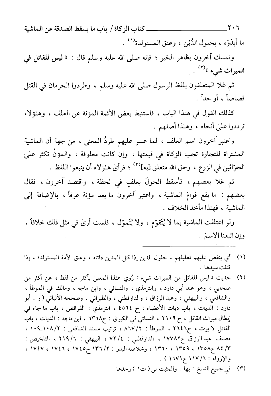 (2) حديث "ليس للقاتل من الميراث شيء" رُوي هذا المعنى بأكثر من لفظ، عن أكثر من صحابي، وهو عند أبي داود، والترمذي، والنسائي، وابن ماجه، ومالك في الموطأ، والشافعي، والبيهقي، وعبد الرزاق، والدارقطني، والطبراني. وصححه الألباني (ر. أبو داود: الديات، باب ديات الأعضاء، ح 4564، الترمذي: الفرائض، باب ما جاء في إبطال ميراث القاتل، ح 2109، النسائي في الكبرى: ح 6368، ابن ماجه: الديات، باب القاتل لا يرث، ح 2646، الموطأ: 2/ 867، ترتيب مسند الشافعي: 2/ 108 - 109، مصنف عبد الرزاق ح 17782، الدارقطني: 4/ 72، البيهقي: 6/ 219، التلخيص: 3/ 84 ح 1358، 1359، 1360، وخلاصة البدر: 2/ 136 ح 1745، 1746، 1747، والإرواء: 6/ 117 ح 1671).