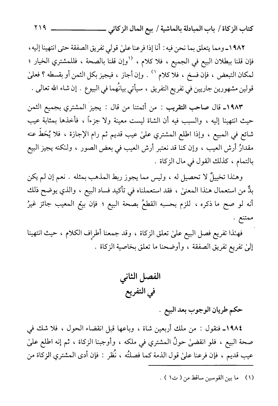 1984 - فنقول: من ملك أربعين شاة، وباعها قبل انقضاء الحول، فلا شك في صحة البيع، فلو انقضى حولُ المشتري في ملكه، وأوجبنا الزكاة، ثم إنه اطلع على عيب قديم، فإن فرعنا على قول الذمة كما فصلتُه، نُظر: فإن أدى المشتري الزكاة من