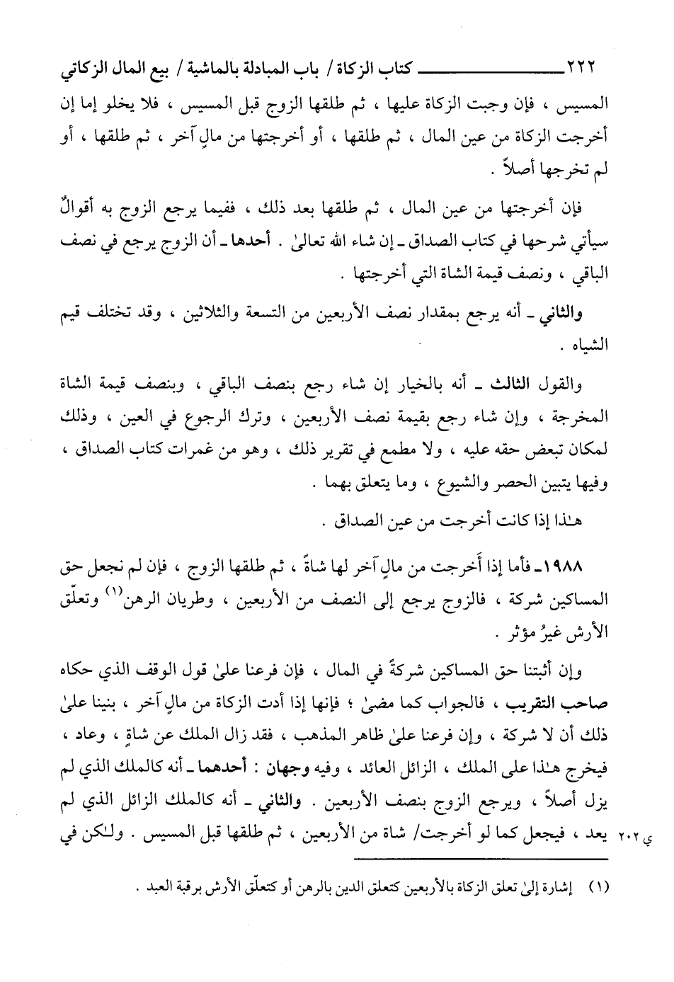 1988 - فأما إذا أَخرجت من مالٍ آخر لها شاةً، ثم طلقها الزوج، فإن لم نجعل حق المساكين شركة، فالزوج يرجع إلى النصف من الأربعين، وطريان الرهن (1) وتعلّق الأرش غيرُ مؤثر.