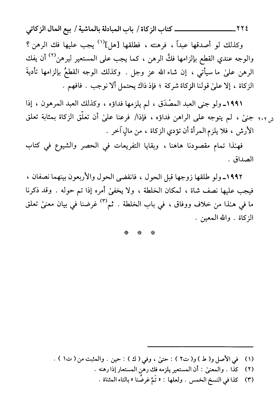 1991 - ولو جنى العبد المصْدَق، لم يلزمها فداؤه، وكذلك العبد المرهون، إذا جنى، لم يتوجه على الراهن فداؤه، فإذا فرعنا على أن تعلّق الزكاة بمثابة تعلق الأرش، فلا يلزم المرأة أن تؤدي الزكاة، من مالٍ آخر.
