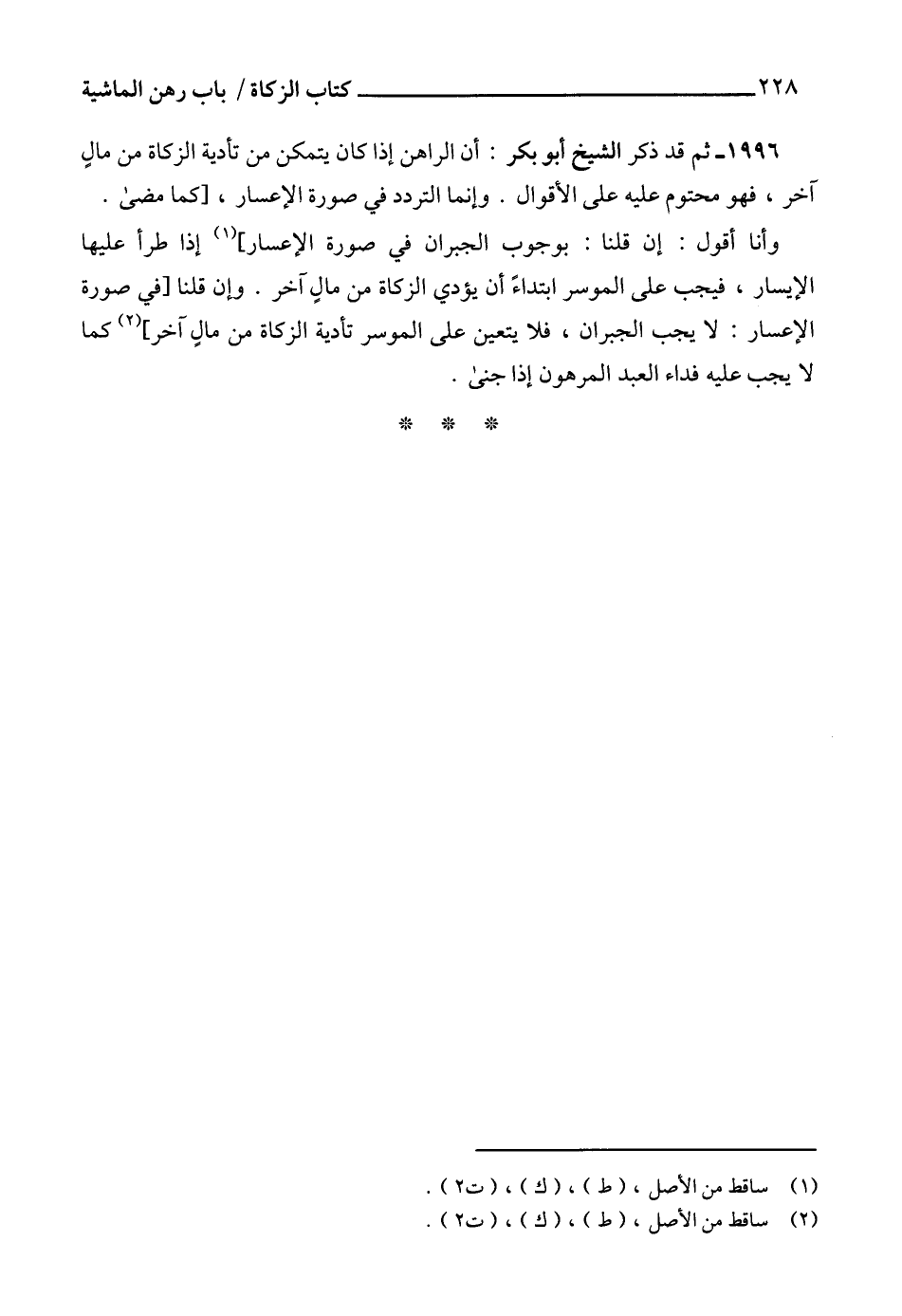 1996 - ثم قد ذكر الشيخ أبو بكر: أن الراهن إذا كان يتمكن من تأدية الزكاة من مالٍ آخر، فهو محتوم عليه على الأقوال. وإنما التردد في صورة الإعسار، [كما مضى.