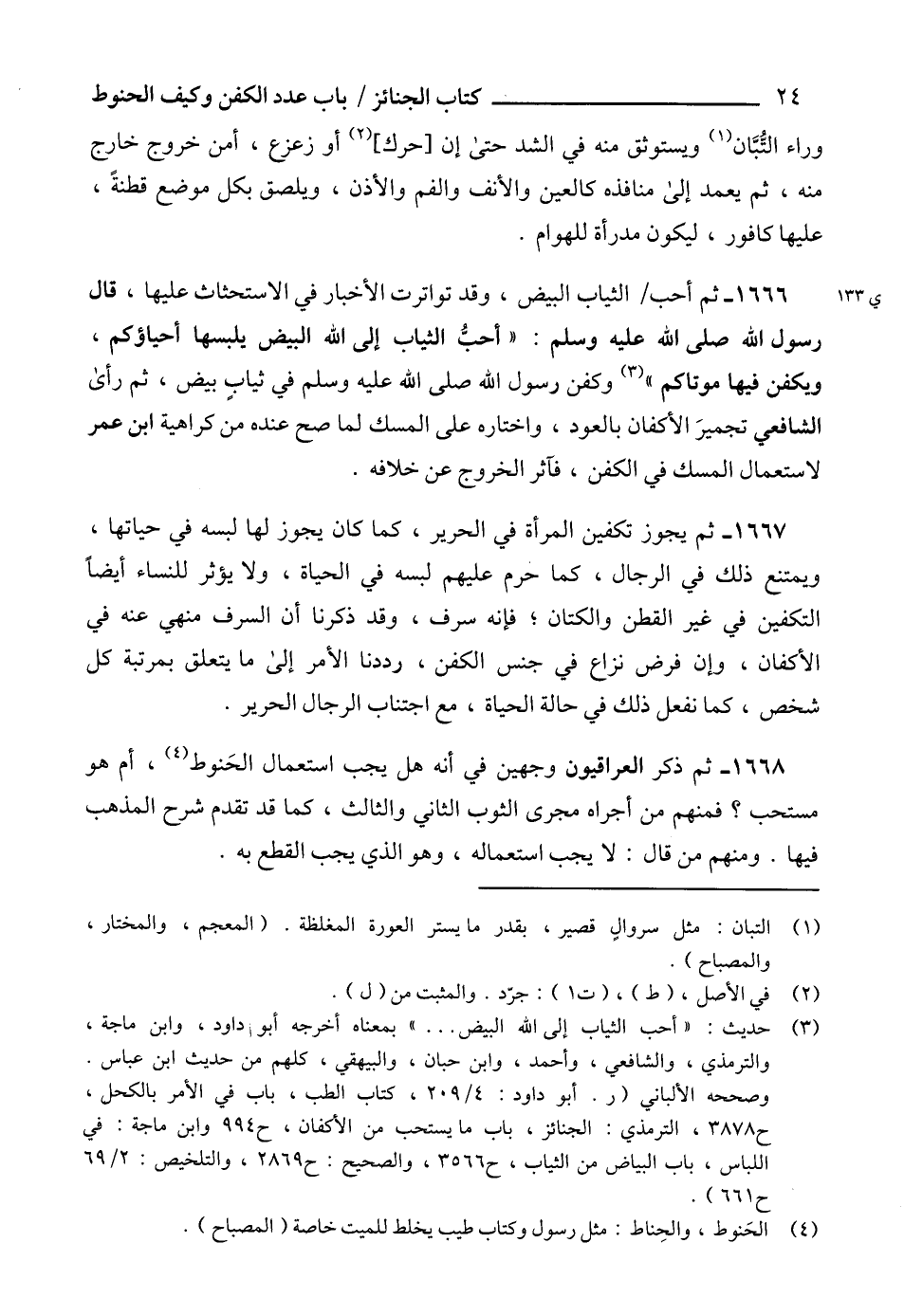 1668 - ثم ذكر العراقيون وجهين في أنه هل يجب استعمال الحَنوط (4)، أم هو مستحب؟ فمنهم من أجراه مجرى الثوب الثاني والثالث، كما قد تقدم شرح المذهب فيها. ومنهم من قال: لا يجب استعماله، وهو الذي يجب القطع به.