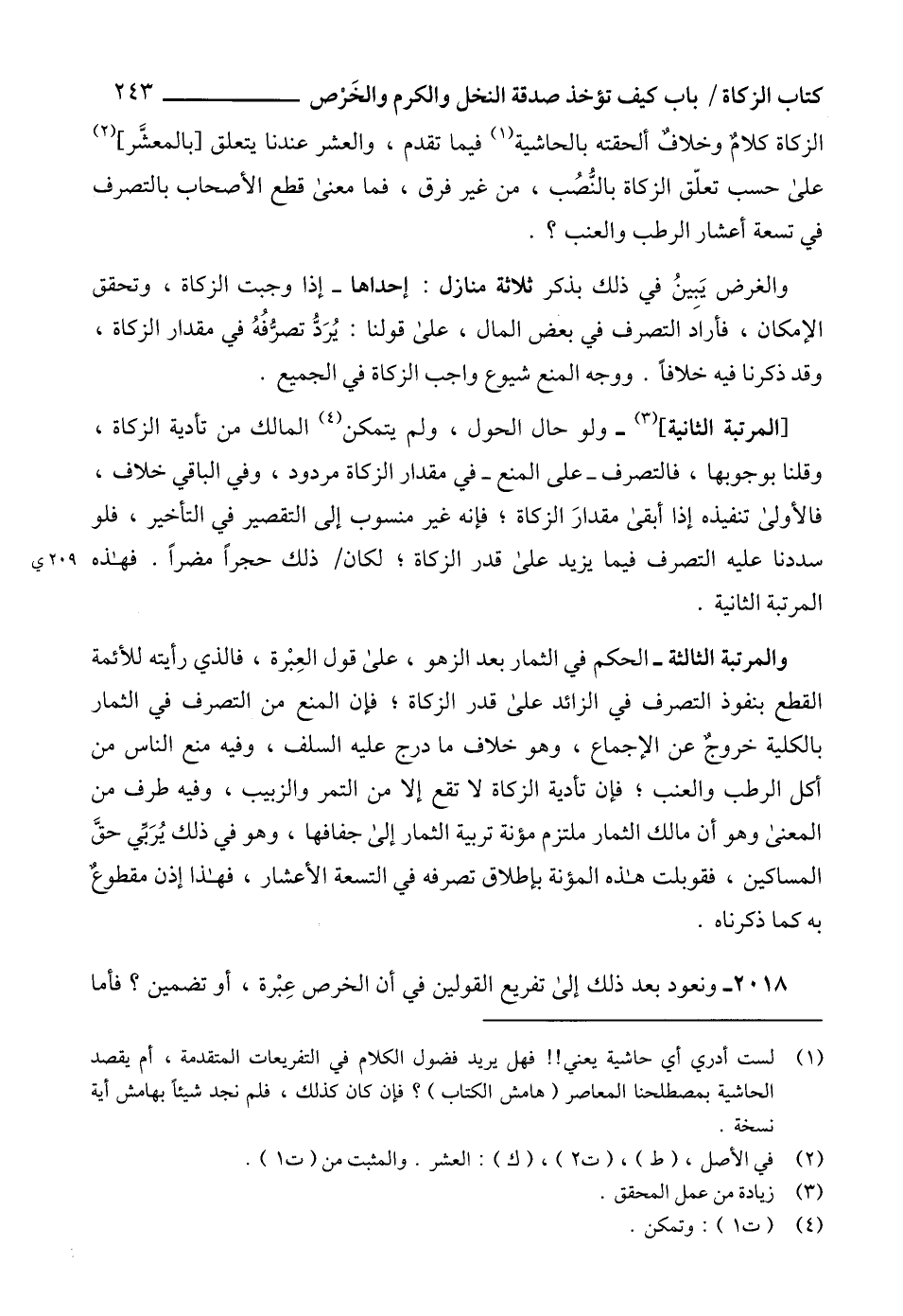 (1) لست أدري أي حاشية يعني!! فهل يريد فضول الكلام في التفريعات المتقدمة، أم يقصد الحاشية بمصطلحنا المعاصر (هامش الكتاب)؛ فإن كان كذلك، فلم نجد شيئاً بهامش أية نسخة.