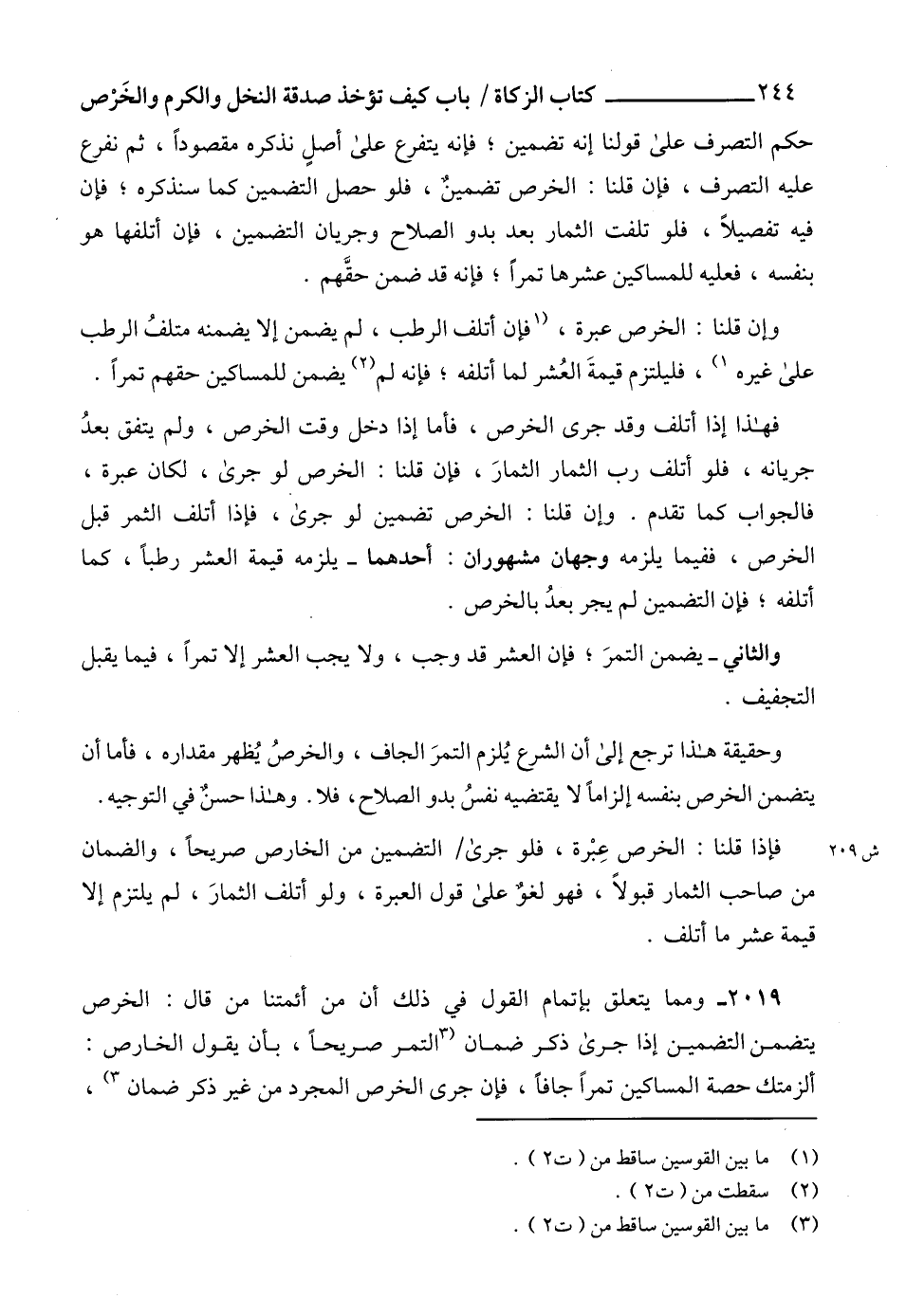 2019 - ومما يتعلق بإتمام القول في ذلك أن من أئمتنا من قال: الخرص يتضمن التضمين إذا جرى ذكر ضمان (3 التمر صريحاً، بأن يقول الخارص: ألزمتك حصة المساكين تمراً جافاً، فإن جرى الخرص المجرد من غير ذكر ضمان 3)،