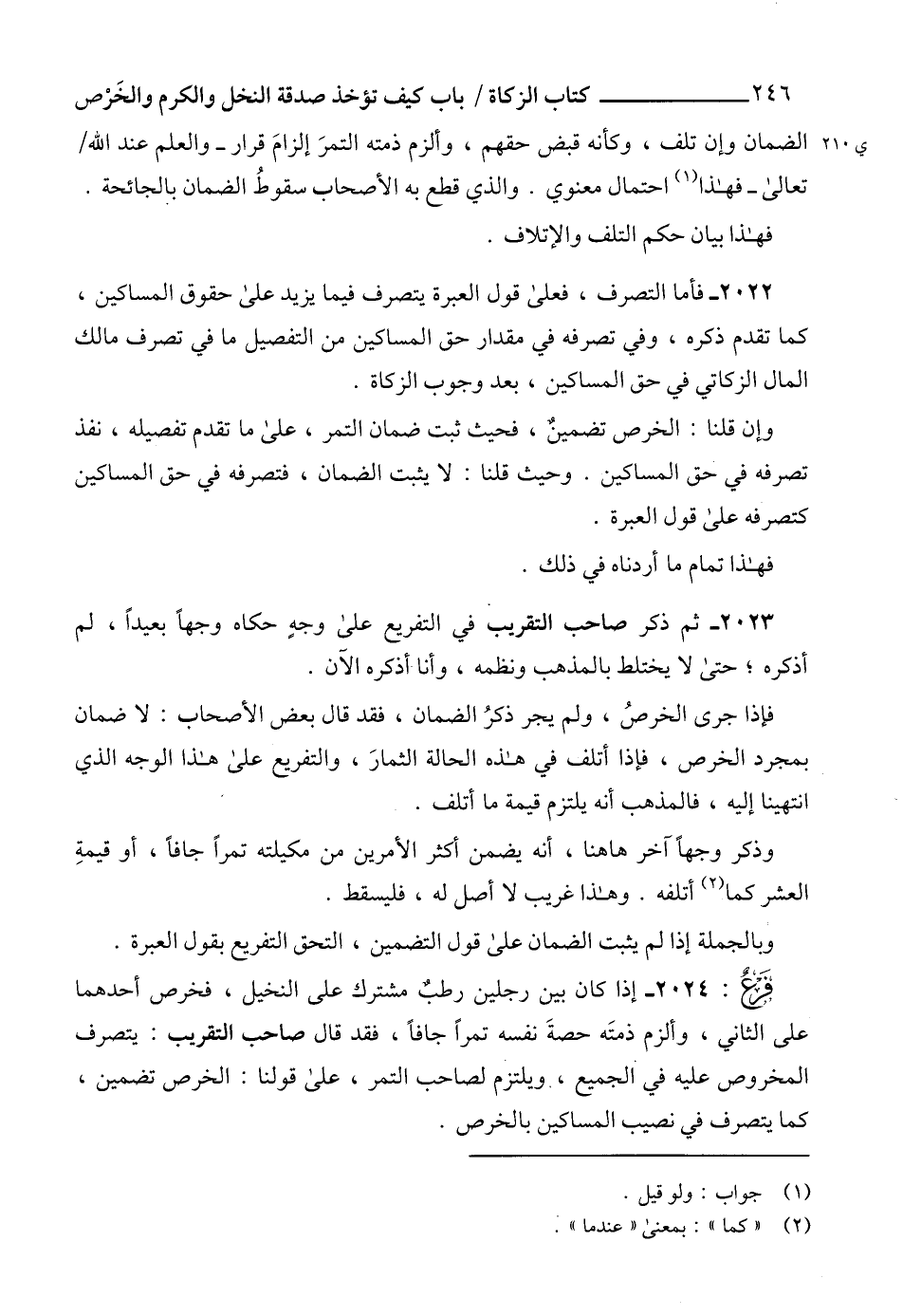 2024 - إذا كان بين رجلين رطب مشترك على النخيل، فخرص أحدهما على الثاني، وألزم ذمتَه حصةَ نفسه تمراً جافاً، فقد قال صاحب التقريب: يتصرف المخروص عليه في الجميع، ويلتزم لصاحب التمر، على قولنا: الخرص تضمين، كما يتصرف في نصيب المساكين بالخرص.