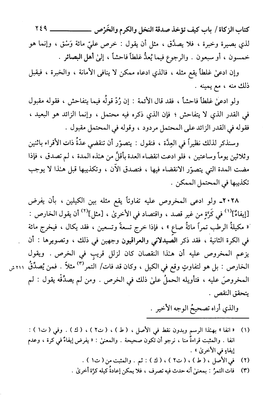 2028 - ولو ادعى المخروص عليه تفاوتاً يقع مثله بين الكيلين، بأن يفرض [إيفاءٌ] (1) في كَرَّةٍ من غير قصد، واقتصاد في الأخرى، [مثل] (2) أن يقول الخارص: "مكيلةُ الرطب تمراً مائةُ صاع"، فإذا خرج تسعةً وتسعين، فقد يكال، فيخرج مائة في الكرة الثانية، فقد ذكر الصيدلاني والعراقيون وجهين في ذلك، وتصويرها: أن يزعم المخروص عليه أن هذا النقصان كان لزلل قريب في الخرص. ويقول الخارص: بل هو لتفاوتٍ وقع في الكيل، وكان قد فات التمر (3) مثلاً. فمن يُصدِّقُ المخروصَ عليه، فتأويله الحملُ على ذلك في الخرص. ومن لم يصدِّقْه يقول: لم يتحقق النقص.