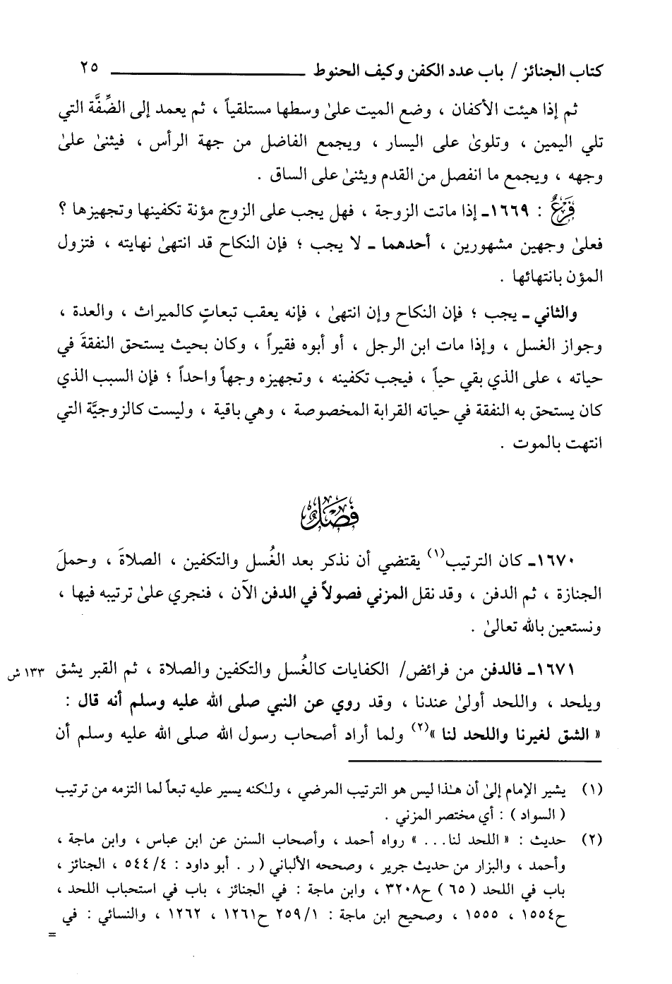 1670 - كان الترتيب (1) يقتضي أن نذكر بعد الغُسل والتكفين، الصلاةَ، وحملَ الجنازة، ثم الدفن، وقد نقل المزني فصولاً في الدفن الآن، فنجري على ترتيبه فيها، ونستعين بالله تعالى.