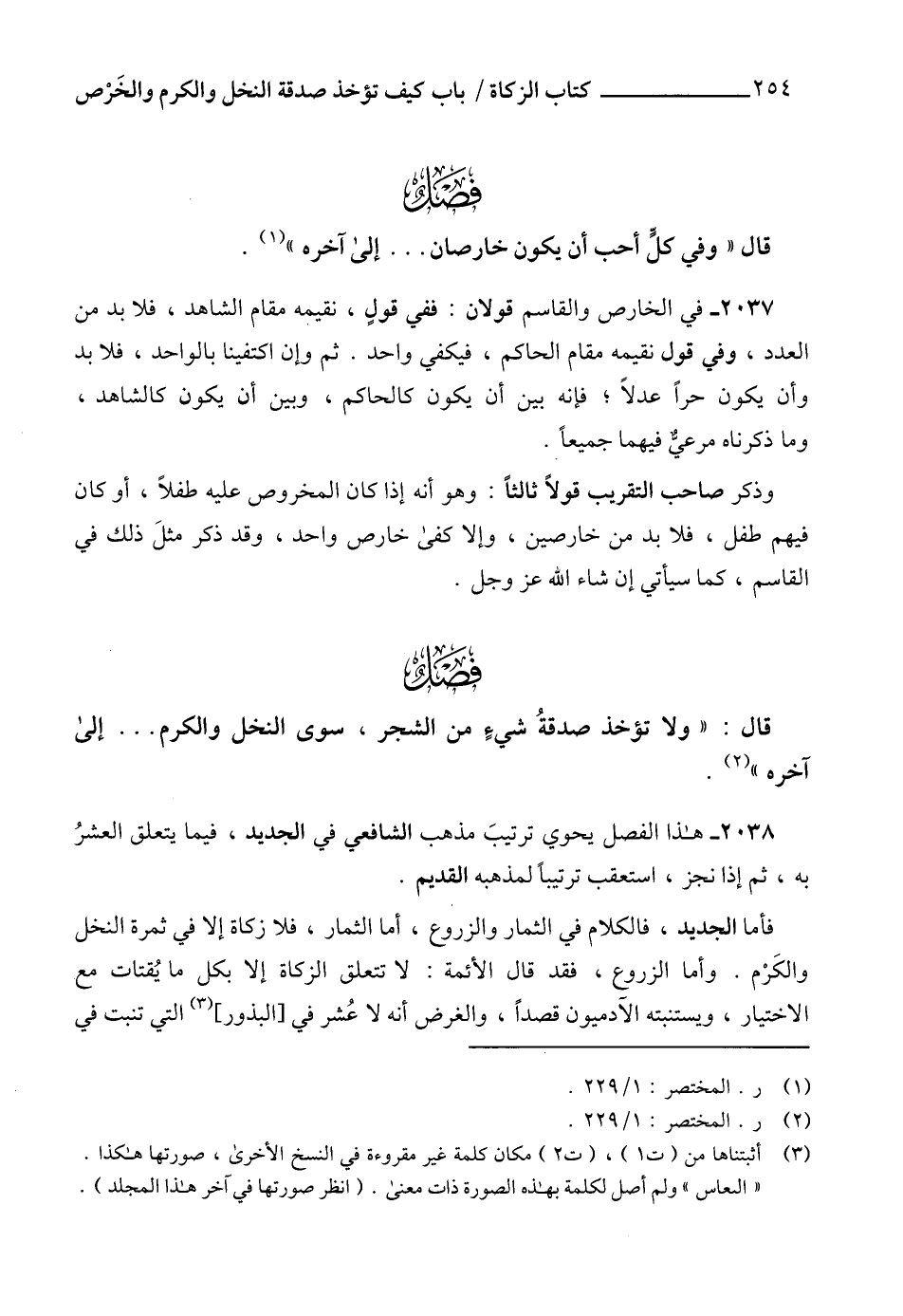 2037 - في الخارص والقاسم قولان: ففي قولٍ، نقيمه مقام الشاهد، فلا بد من العدد، وفي قول نقيمه مقام الحاكم، فيكفي واحد. ثم وإن اكتفينا بالواحد، فلا بد وأن يكون حراً عدلاً؛ فإنه بين أن يكون كالحاكم، وبين أن يكون كالشاهد، وما ذكرناه مرعيٌّ فيهما جميعاً.