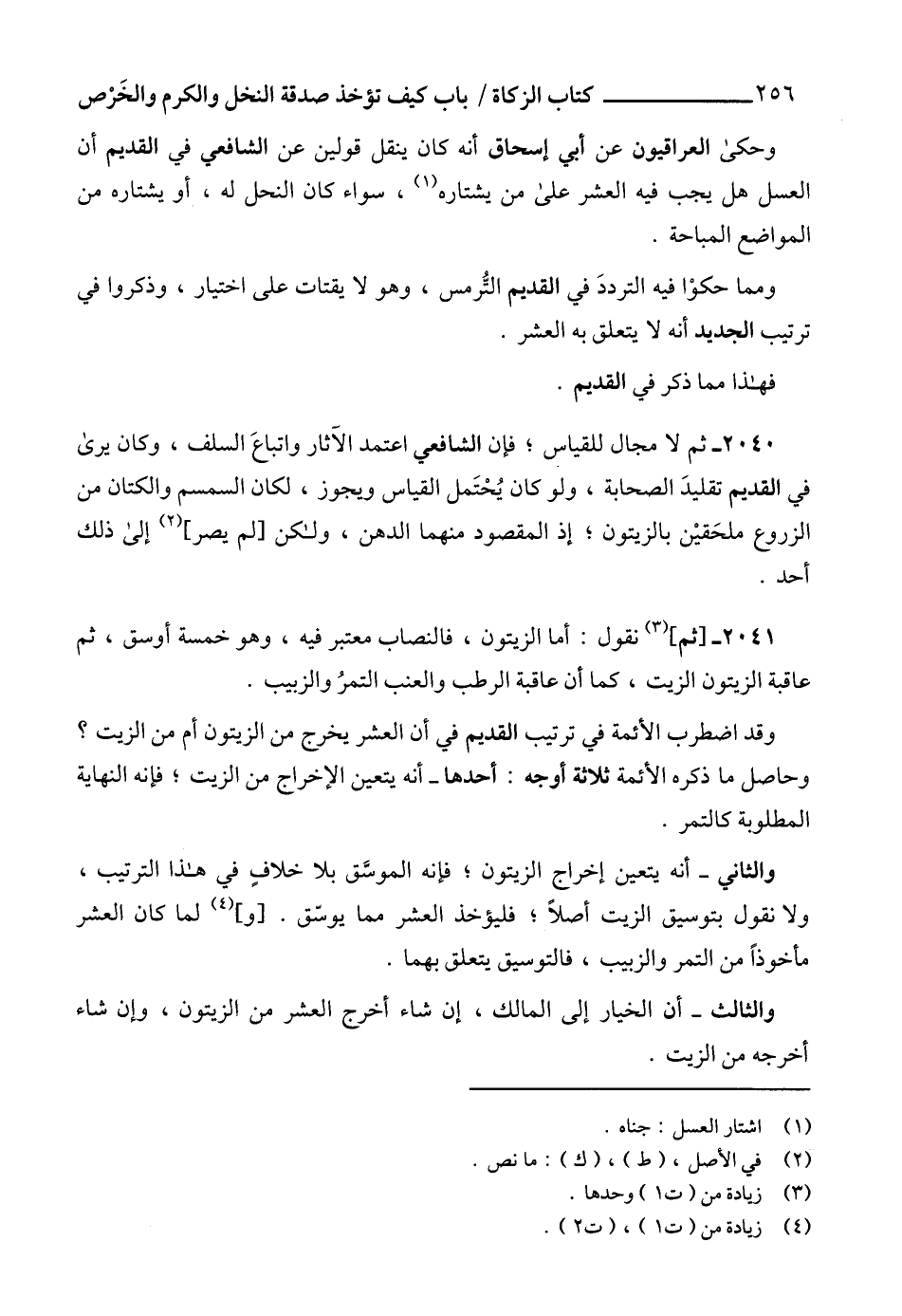 2041 - [ثم] (3) نقول: أما الزيتون، فالنصاب معتبر فيه، وهو خمسة أوسق، ثم عاقبة الزيتون الزيت، كما أن عاقبة الرطب والعنب التمرُ والزبيب.