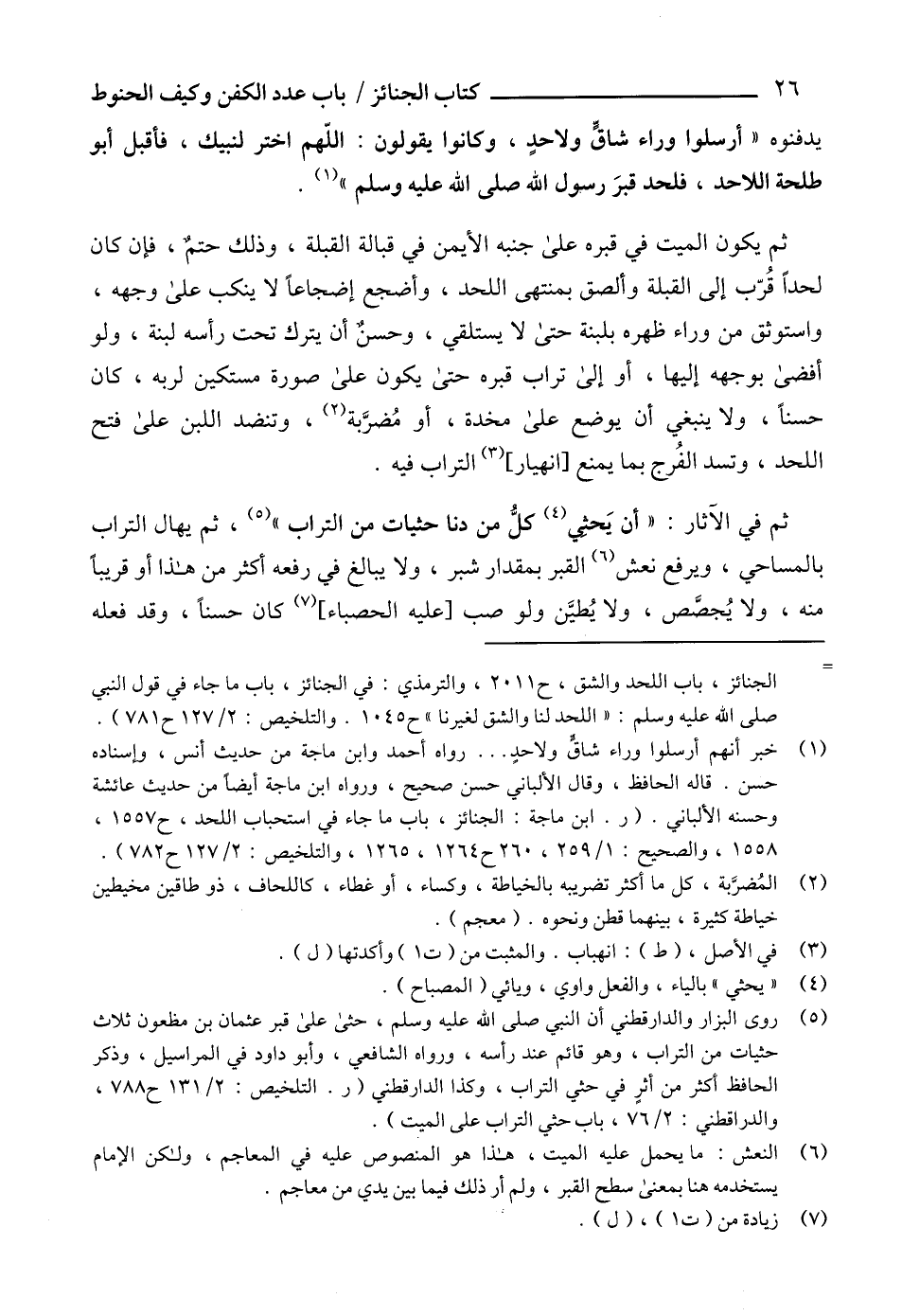(6) النعش: ما يحمل عليه الميت، هذا هو المنصوص عليه في المعاجم، ولكن الإمام يستخدمه هنا بمعنى سطح القبر، ولم أر ذلك فيما بين يدي من معاجم.