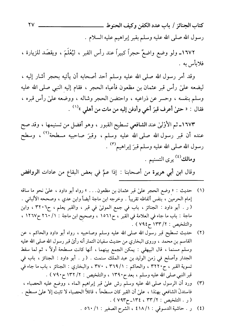 (3) ورد أن الرسول صلى الله عليه وسلم رش على قبر إبراهيم الماء، ووضع عليه الحصباء، فاستدلّ الشافعي بهذا، على أن القبر كان مسطحاً، قائلاً الحصباء لا تثبت إلا على مسطح. (ر. التلخيص: 2/ 33، 134 - ح 793).