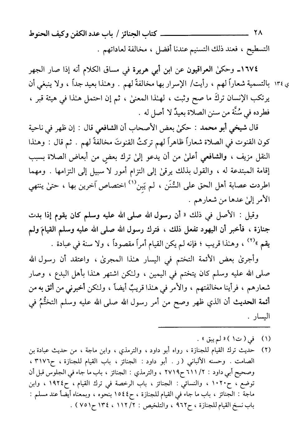 (2) حديث ترك القيام للجنازة، رواه أبو داود، والترمذي، وابن ماجة، من حديث عبادة بن الصامت. وحسنه الألباني (ر. أبو داود: الجنائز، باب القيام للجنازة، ح 3176، وصحيح أبي داود: 2/ 611 ح 2719، والترمذي: الجنائز، باب ما جاء في الجلوس قبل أن توضع، ح 1020، والنسائي: الجنائز، باب الرخصة في ترك القيام، ح 1924، وابن ماجة: الجنائز، باب ما جاء في القيام للجنازة، ح 1544 بنحوه، وبمعناه أيضاً عند مسلم: باب نسخ القيام للجنازة، ح 962، والتلخيص: 2/ 112، 134 ح 751).