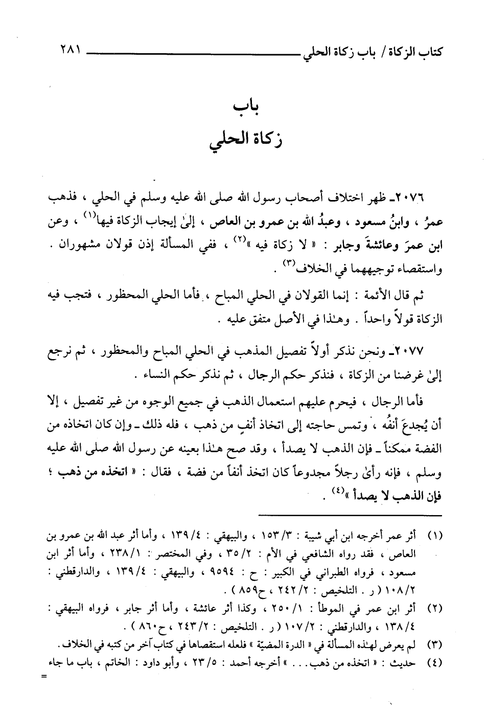 2076 - ظهر اختلاف أصحاب رسول الله صلى الله عليه وسلم في الحلي، فذهب عمرُ، وابنُ مسعود، وعبدُ الله بن عمرو بن العاص، إلى إيجاب الزكاة فيها (1)، وعن ابن عمرَ وعائشةَ وجابر: "لا زكاة فيه" (2)، ففي المسألة إذن قولان مشهوران.
